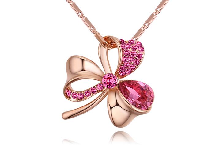 Dije con cadena en baño de oro rosa de 18 quilates, diseño de trébol con cristal rosa corte pera e incrustaciones de cristales en color rosa.