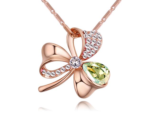 Dije con cadena en baño de oro rosa de 18 quilates, diseño de trébol con cristal verde lima corte pera e incrustaciones de cristales blancos.
