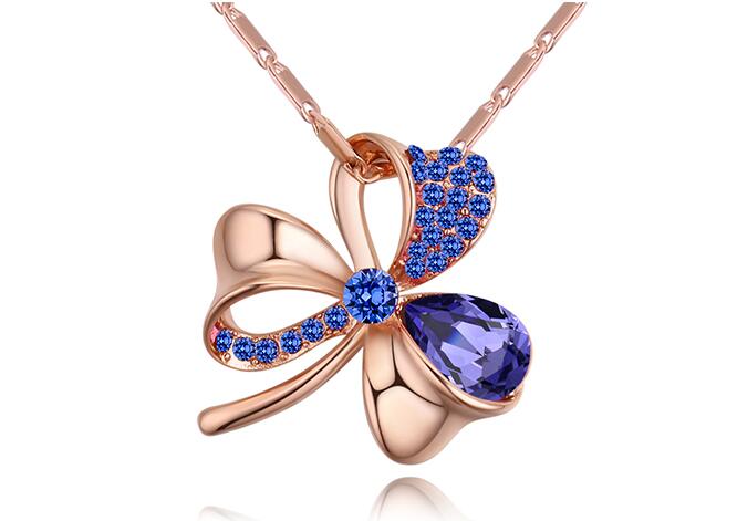 Dije con cadena en baño de oro rosa de 18 quilates, diseño de trébol, con cristal morado corte pera e incrustaciones de cristales morados.