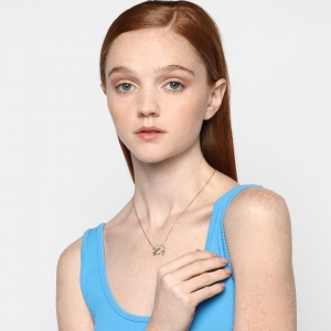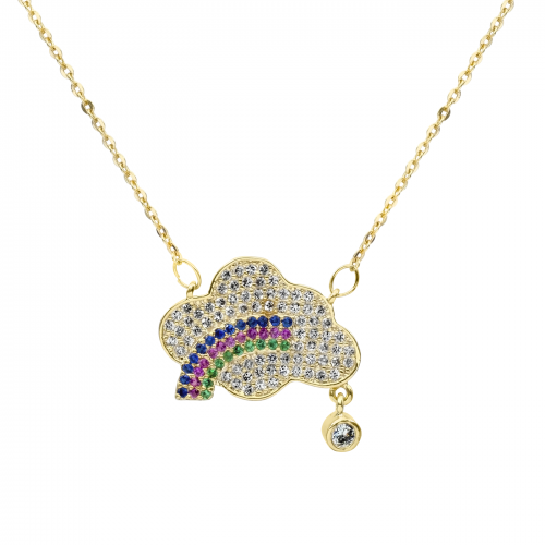 Tierno collar en ba�o de oro amarillo de 18 quilates, dise�o de nube y arco�ris con incrustaciones de cristales en color blanco, azul, rosa y verde y peque�o dije de cristal blanco corte brillante.
