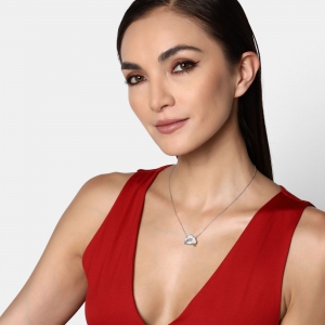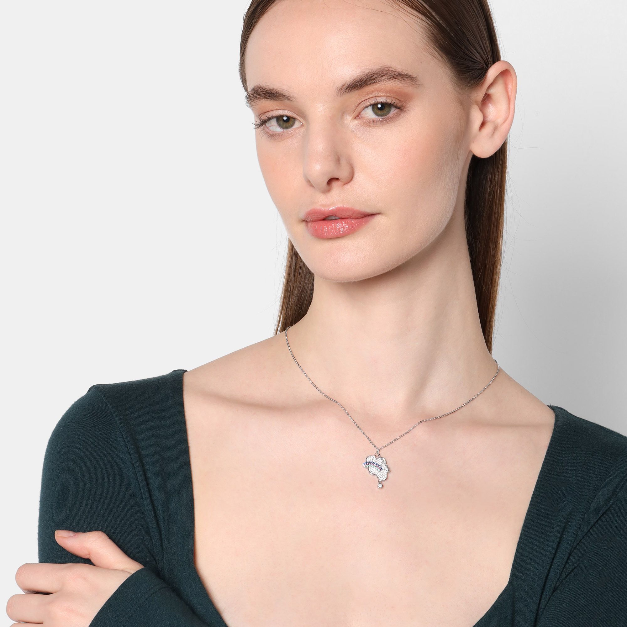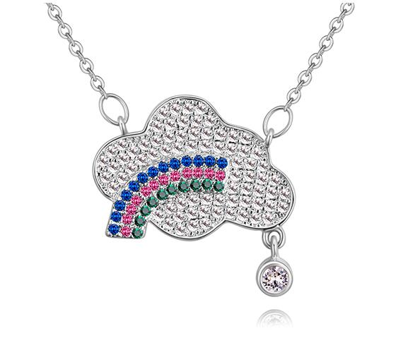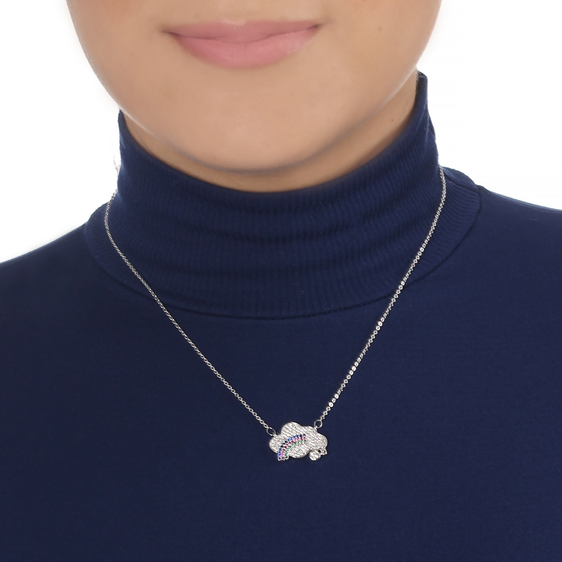 Tierno collar en ba�o de oro blanco de 18 quilates, dise�o de nube y arco�ris con incrustaciones de cristales en color blanco, azul, rosa y verde y peque�o dije de cristal blanco corte brillante.