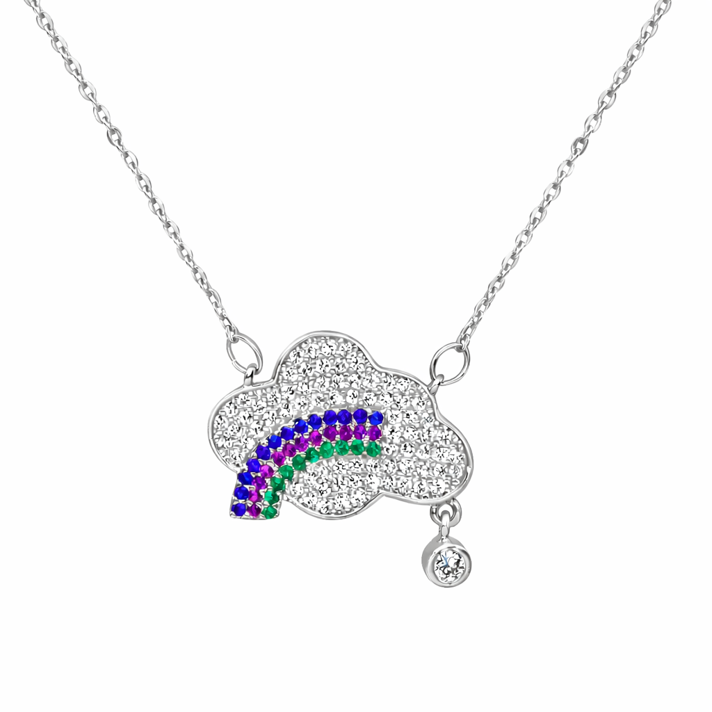 Tierno collar en ba�o de oro blanco de 18 quilates, dise�o de nube y arco�ris con incrustaciones de cristales en color blanco, azul, rosa y verde y peque�o dije de cristal blanco corte brillante.