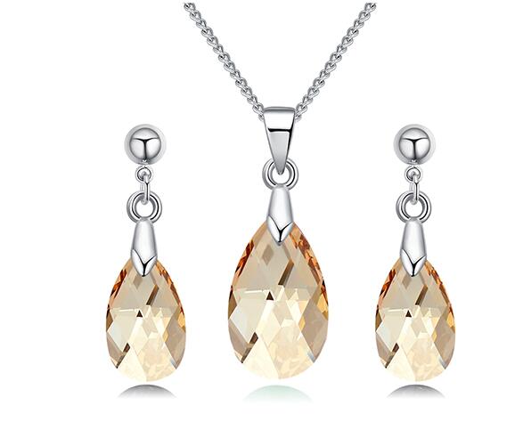 Juego de aretes y dije con cadena en baño de oro blanco de 18 quilates, diseño de gota con cristales en color ámbar.