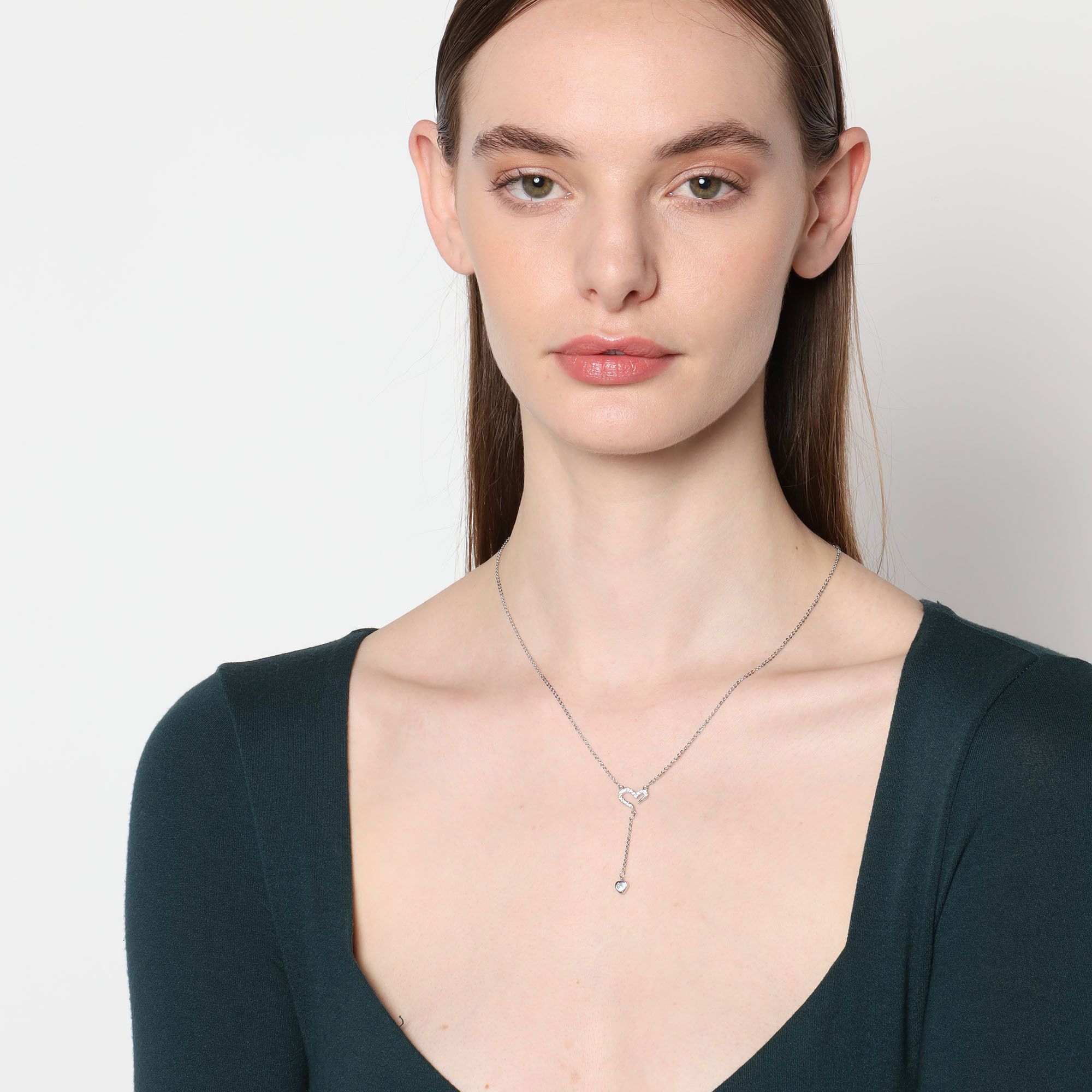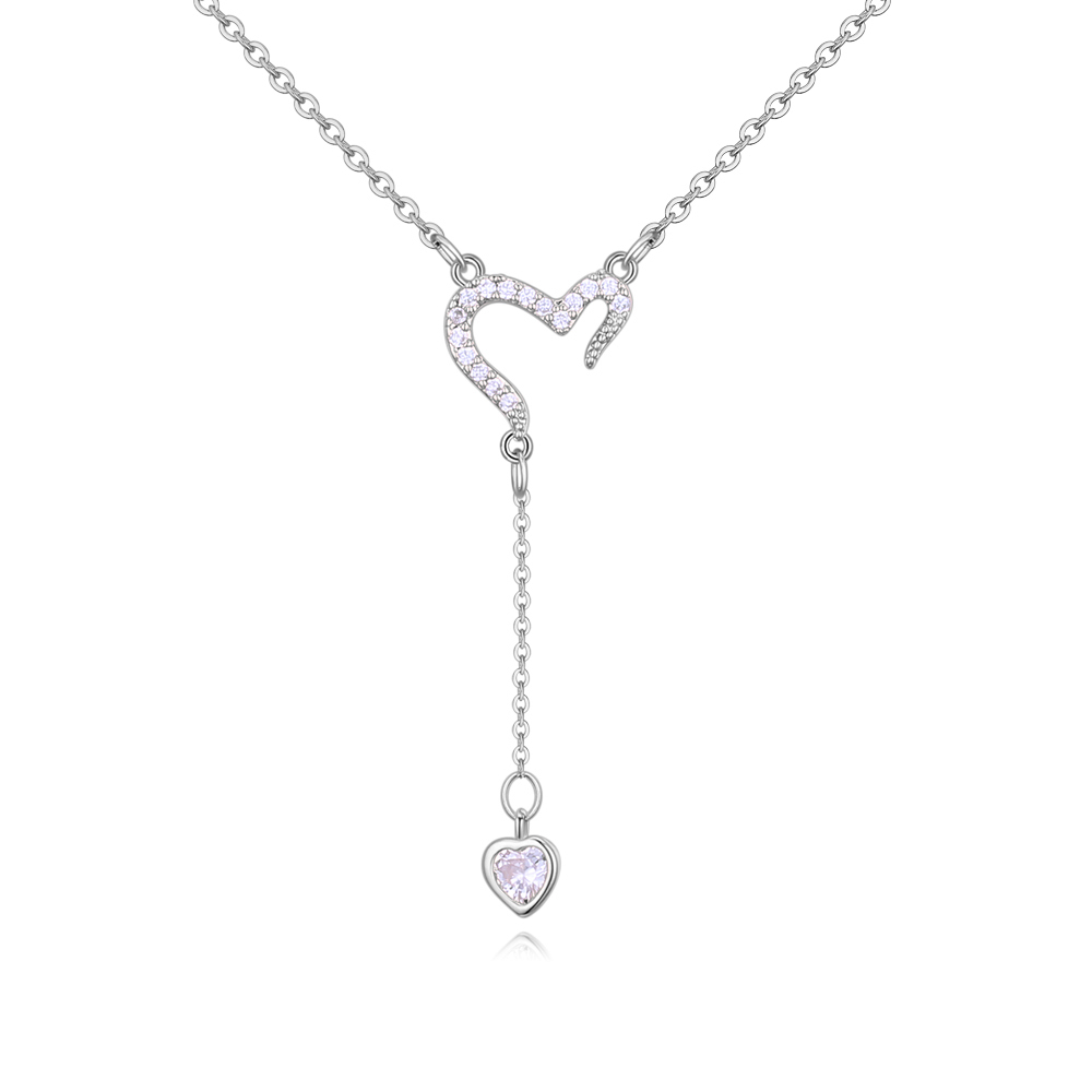 Collar en baño de oro blanco de 18 quilates, diseño de corazones, con incrustaciones de cristales en color blanco y fina cadena.