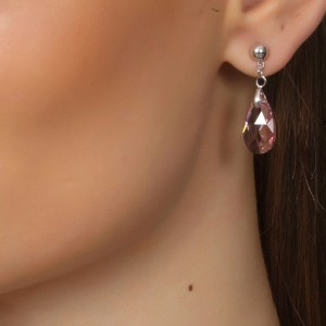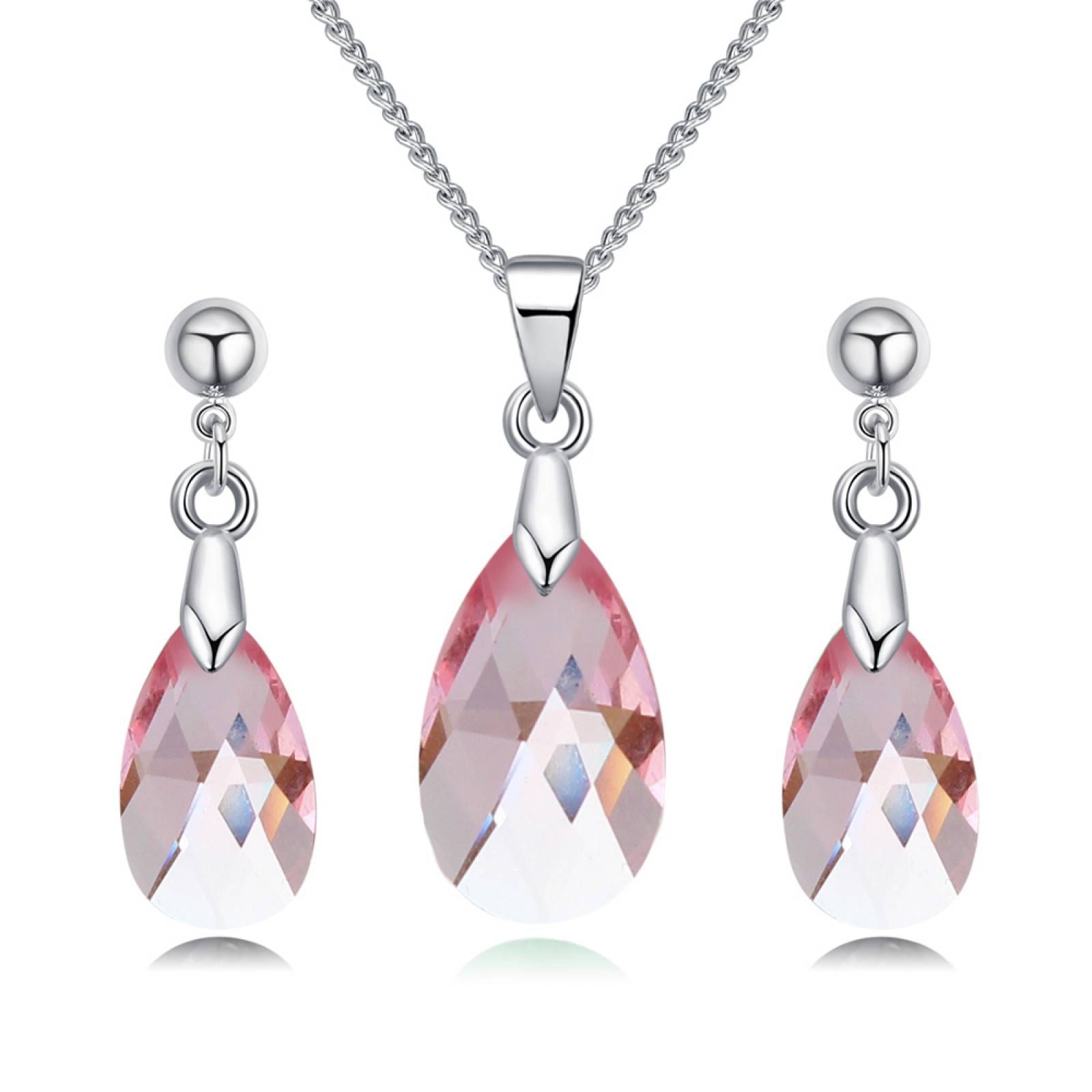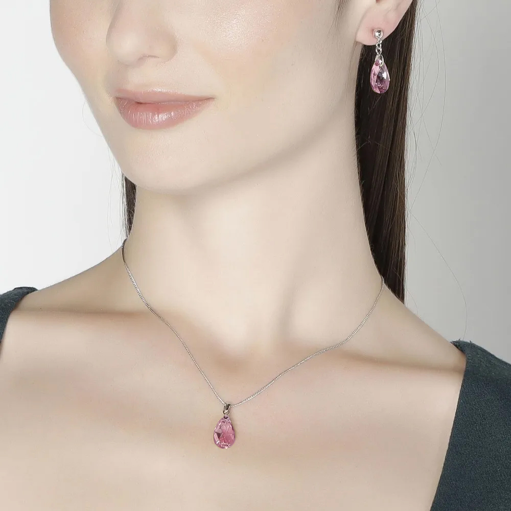 Juego de aretes y dije con cadena en baño de oro blanco de 18 quilates, diseño de gota con cristales en color rosa.