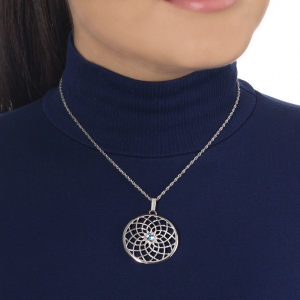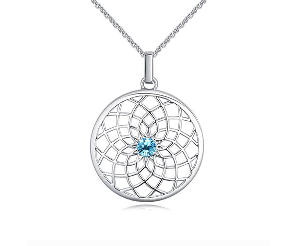Dije con cadena en baño de oro blanco de 18 quilates, diseño atrapa sueños, con cristal azul corte brillante.