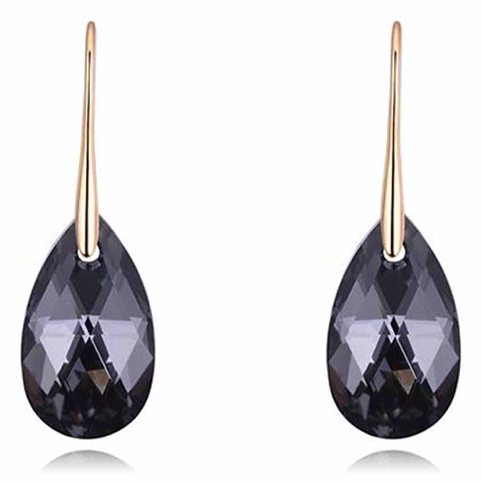 Elegantes aretes en Baño de oro amarillo de 18 quilates, diseño de gota con cristales en color gris oxford corte pera.