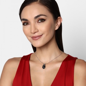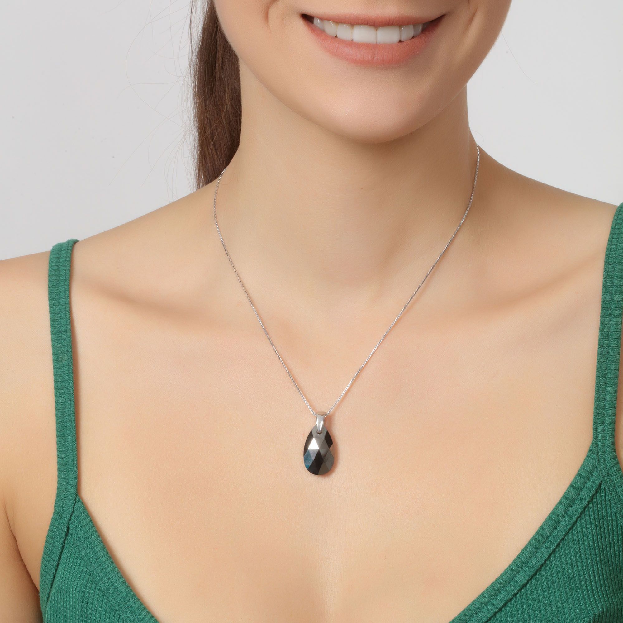 Dije con cadena en baño de oro blanco de 18 quilates, diseño de gota con cristal oxford corte briolette e incrustaciones de cristales blancos.
