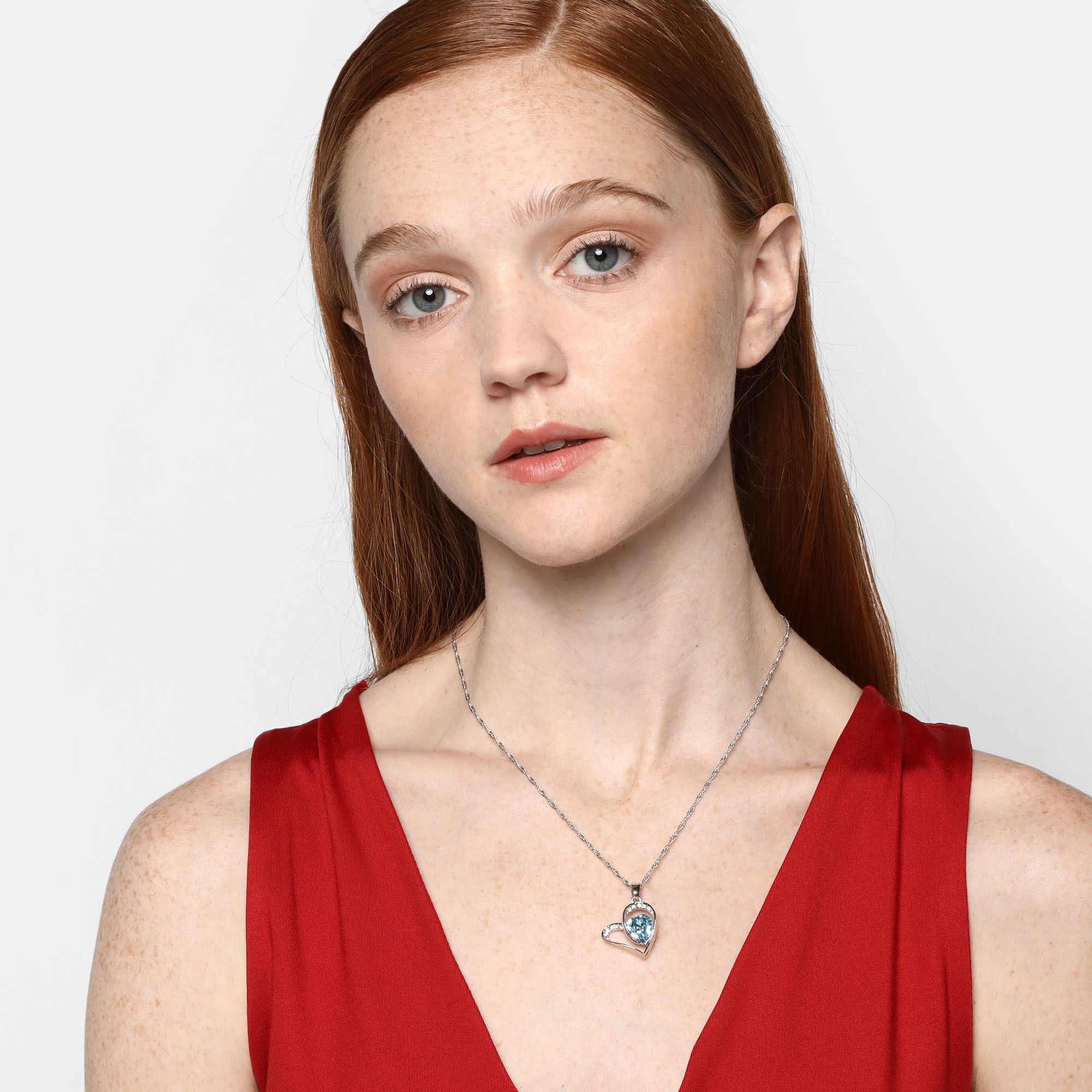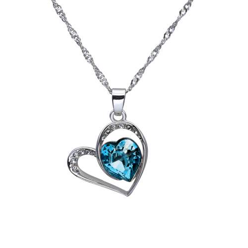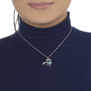 Dije con cadena en ba�o de oro blanco de 18 quilates, dise�o de corazones, con cristal azul corte coraz�n e incrustaciones de cristales tornasol.