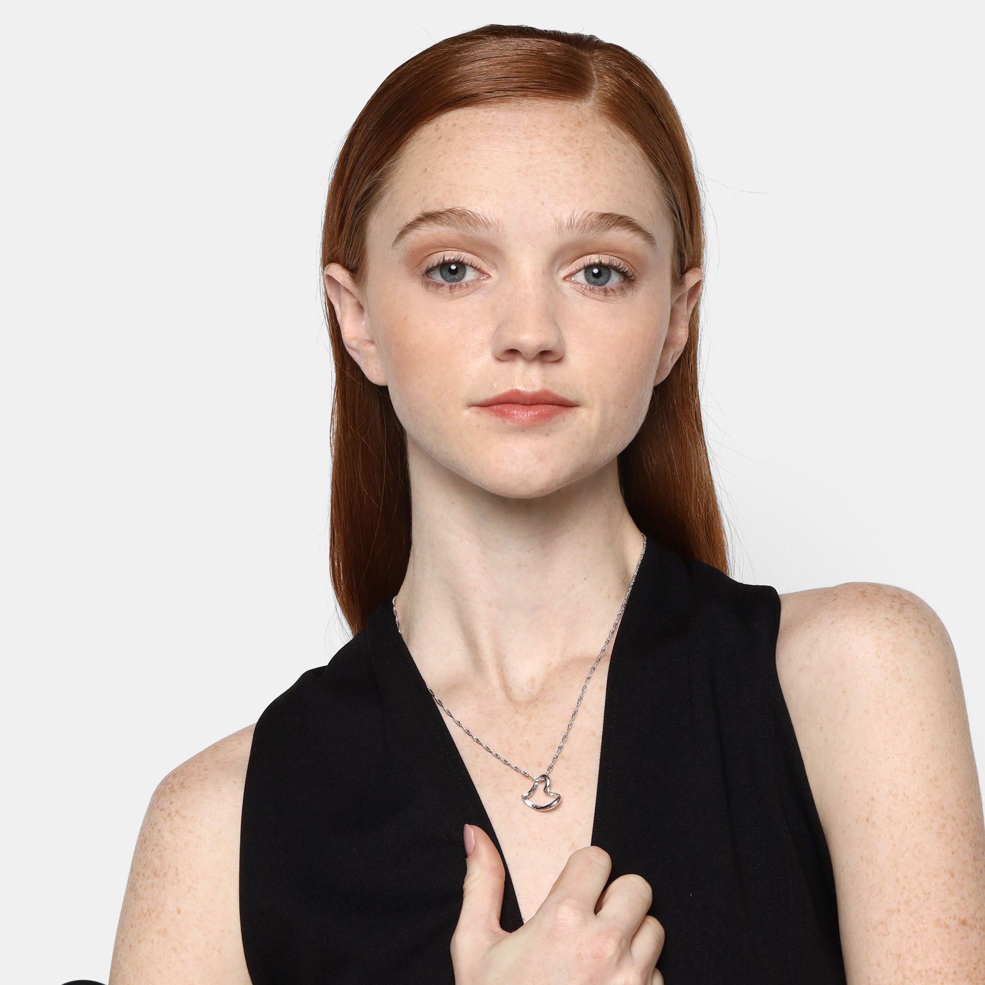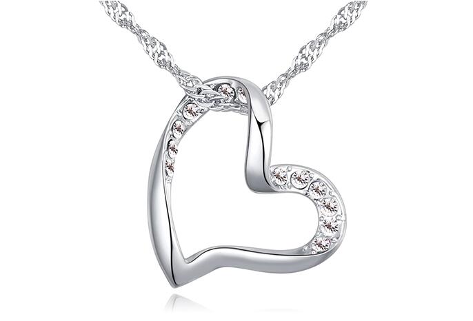 Dije con cadena en ba�o de oro blanco de 18 quilates, dise�o de coraz�n con incrustaciones de cristales blancos.
