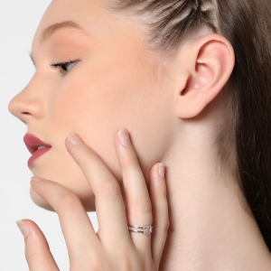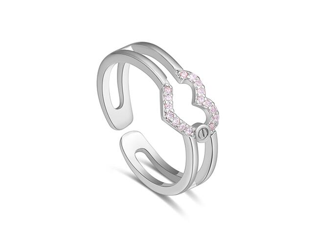 Lindo anillo ajustable, en baño de oro blanco de 18 quilates, diseño de corazón, con detalle en relieve e incrustraciones de cristales en color blanco.