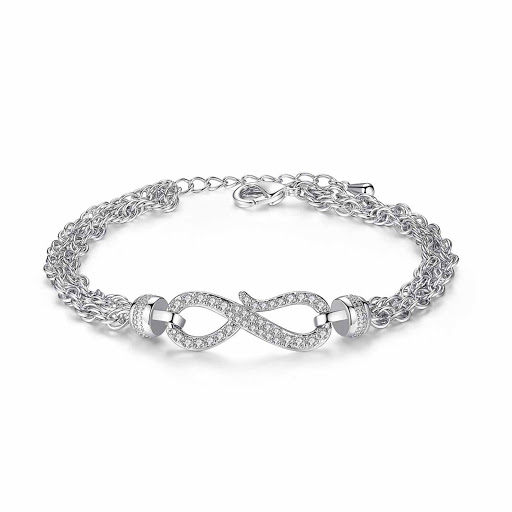 Lindo brazalete, en baño de oro blanco de 18 quilates, diseño de infinito "∞", con incrustaciones de cristales en color blanco y correa de cadenas.