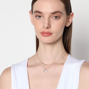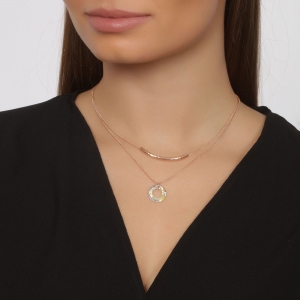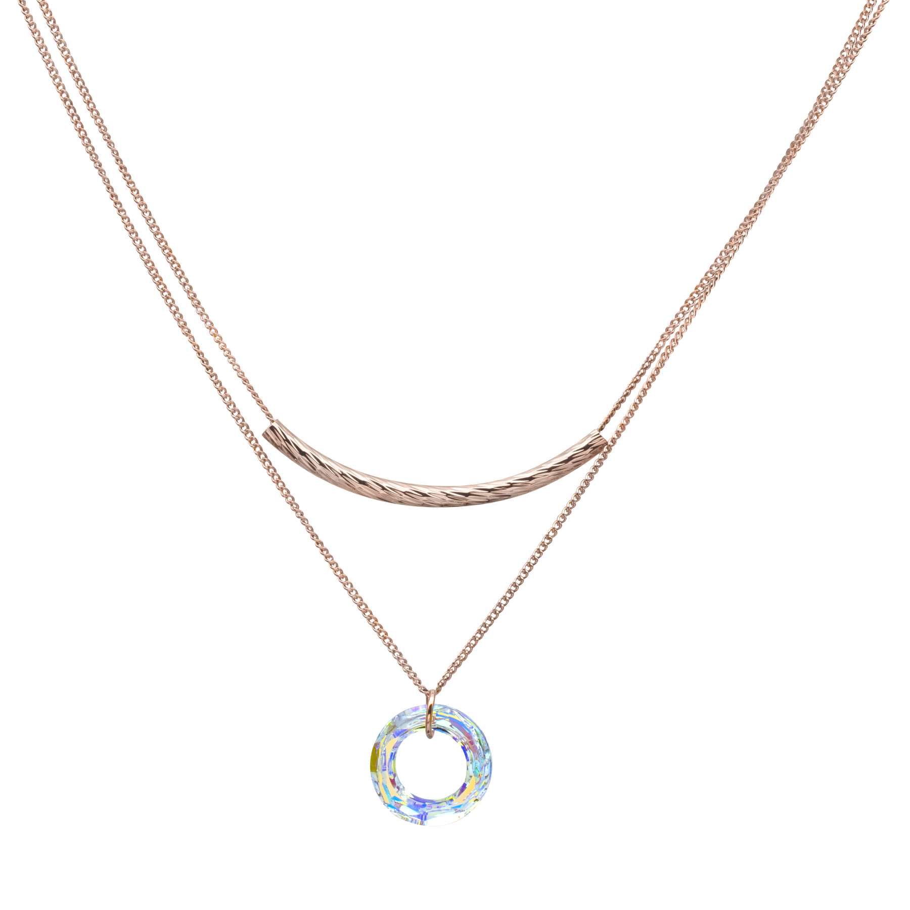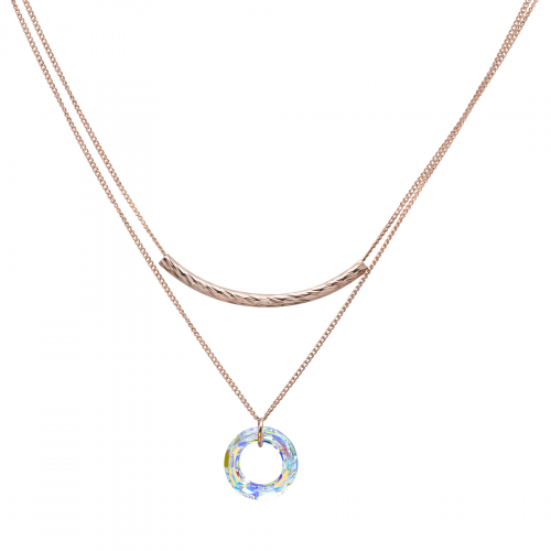 Dije con cadena en baño de oro rosa de 18 quilates, diseño estilo doble cadena, con aro de cristal aurora boreal.