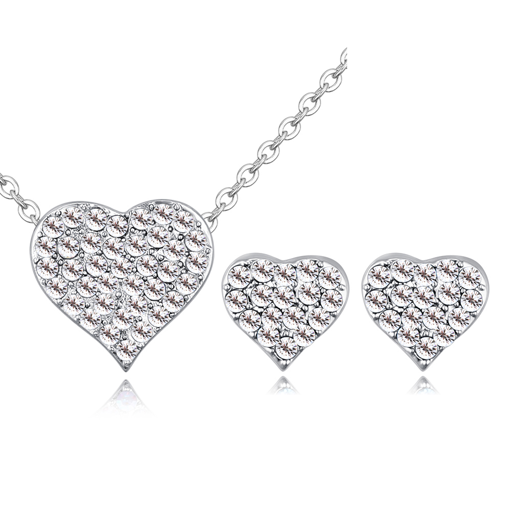 Juego de aretes y dije en baño de oro blanco de 18 quilates, diseño de corazón con incrustación de cristales en color blanco.