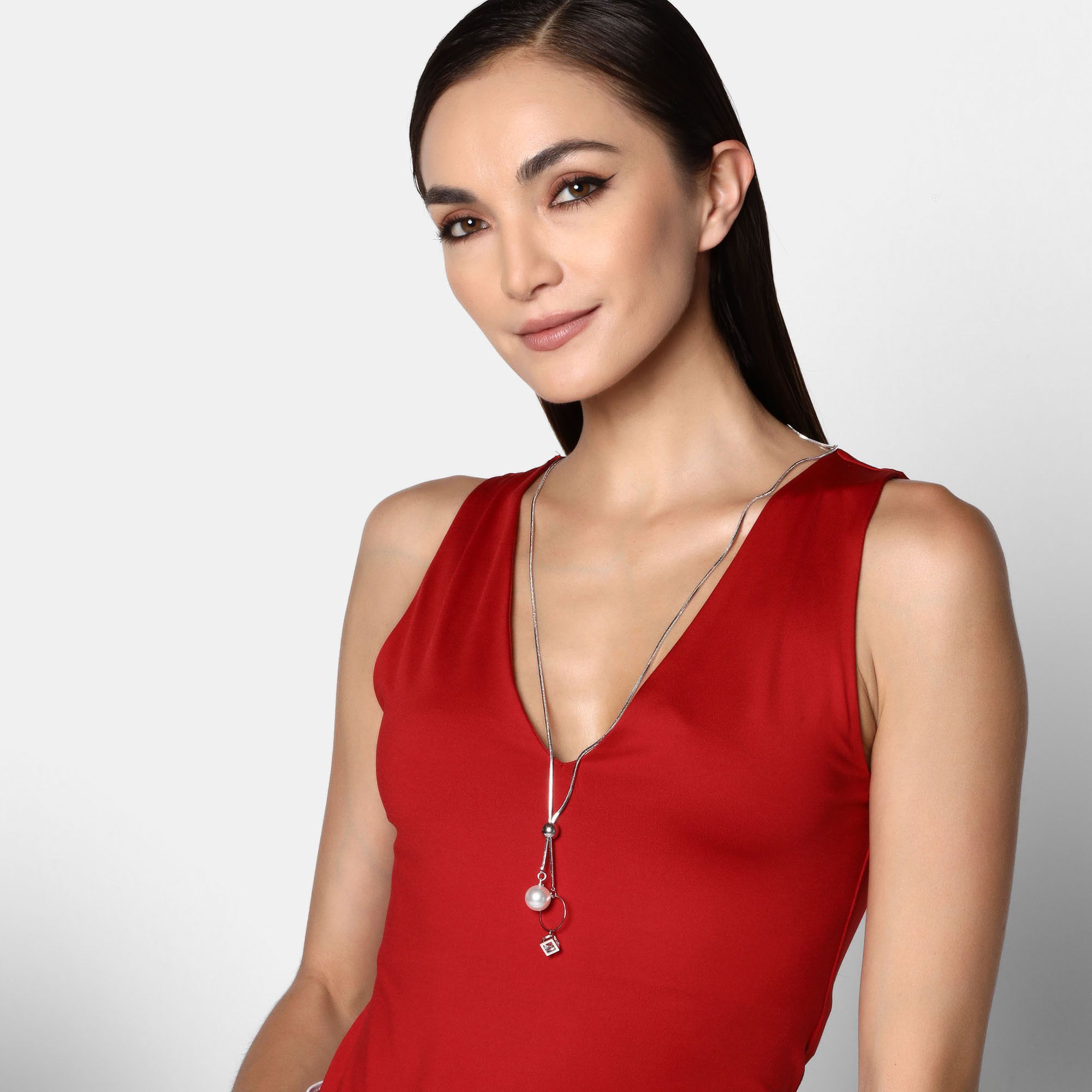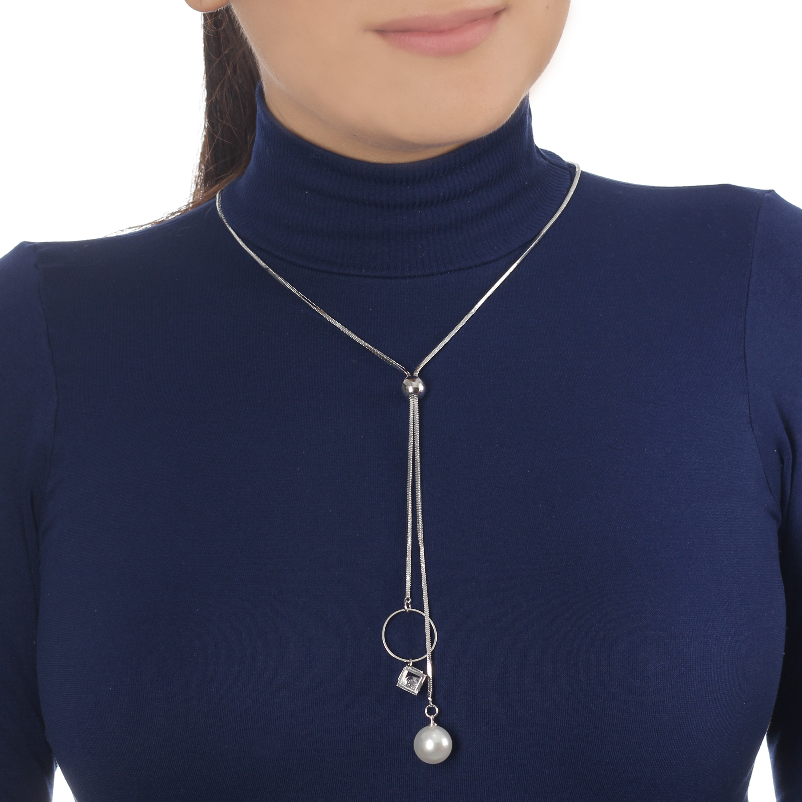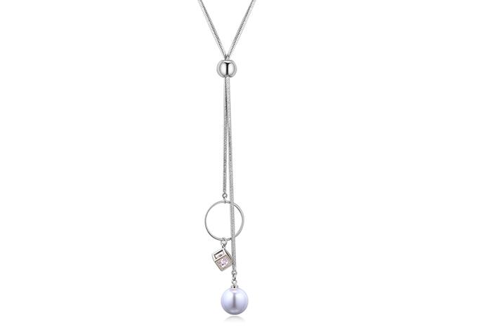 Collar en baño de oro blanco de 18 quilates, original diseño de aro plateado, con cubo, cristal y perla en color blanco.