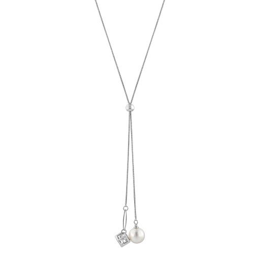Collar en baño de oro blanco de 18 quilates, original diseño de aro plateado, con cubo, cristal y perla en color blanco.