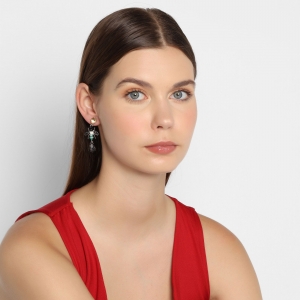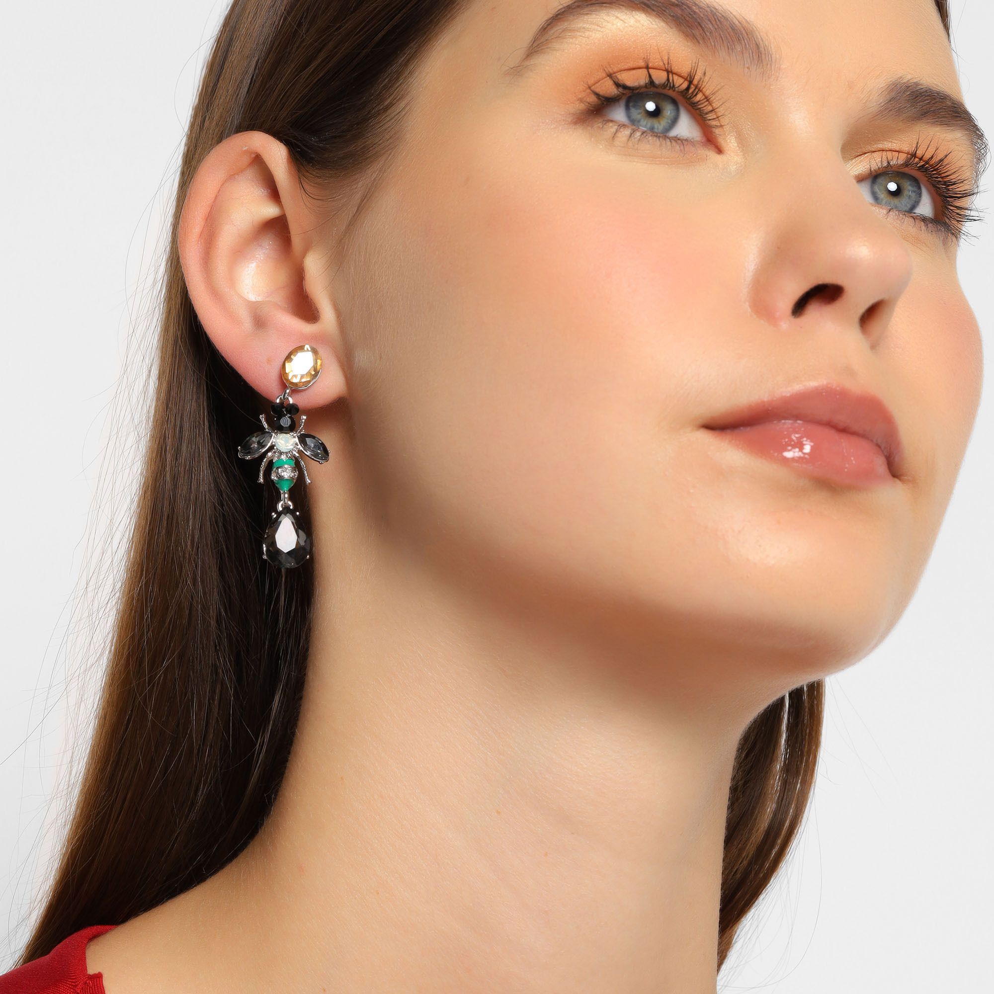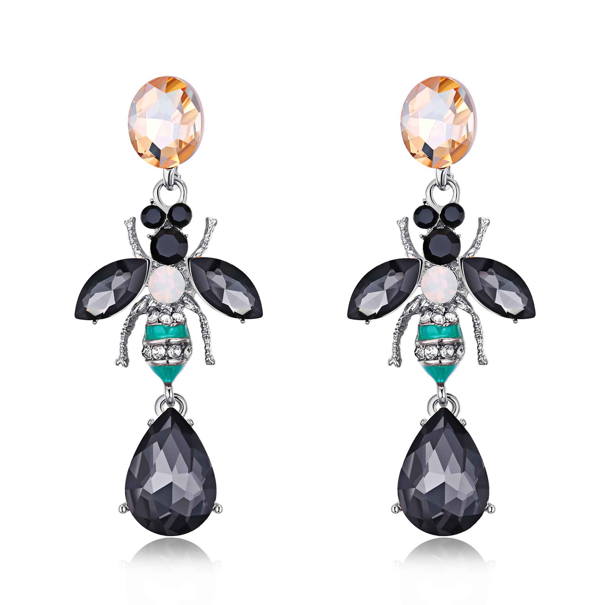 Lindos y originales aretes en baño de oro blanco de 18 quilates, diseño de pequeño insecto, con cristal humo corte pera, cristales negros, cristal ámbar y tornasol corte brillante, detalles esmaltados en color aqua e incrustaciones de cristales blancos.