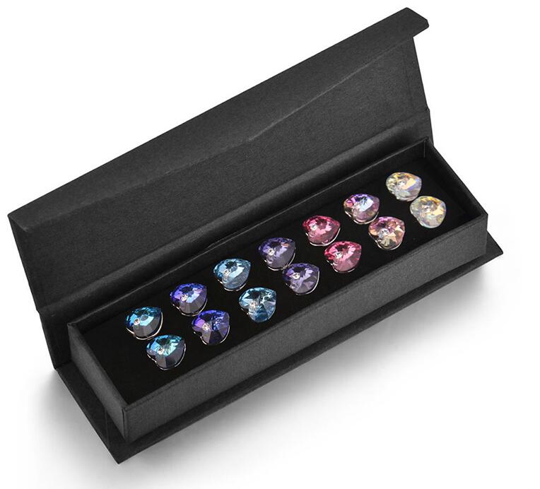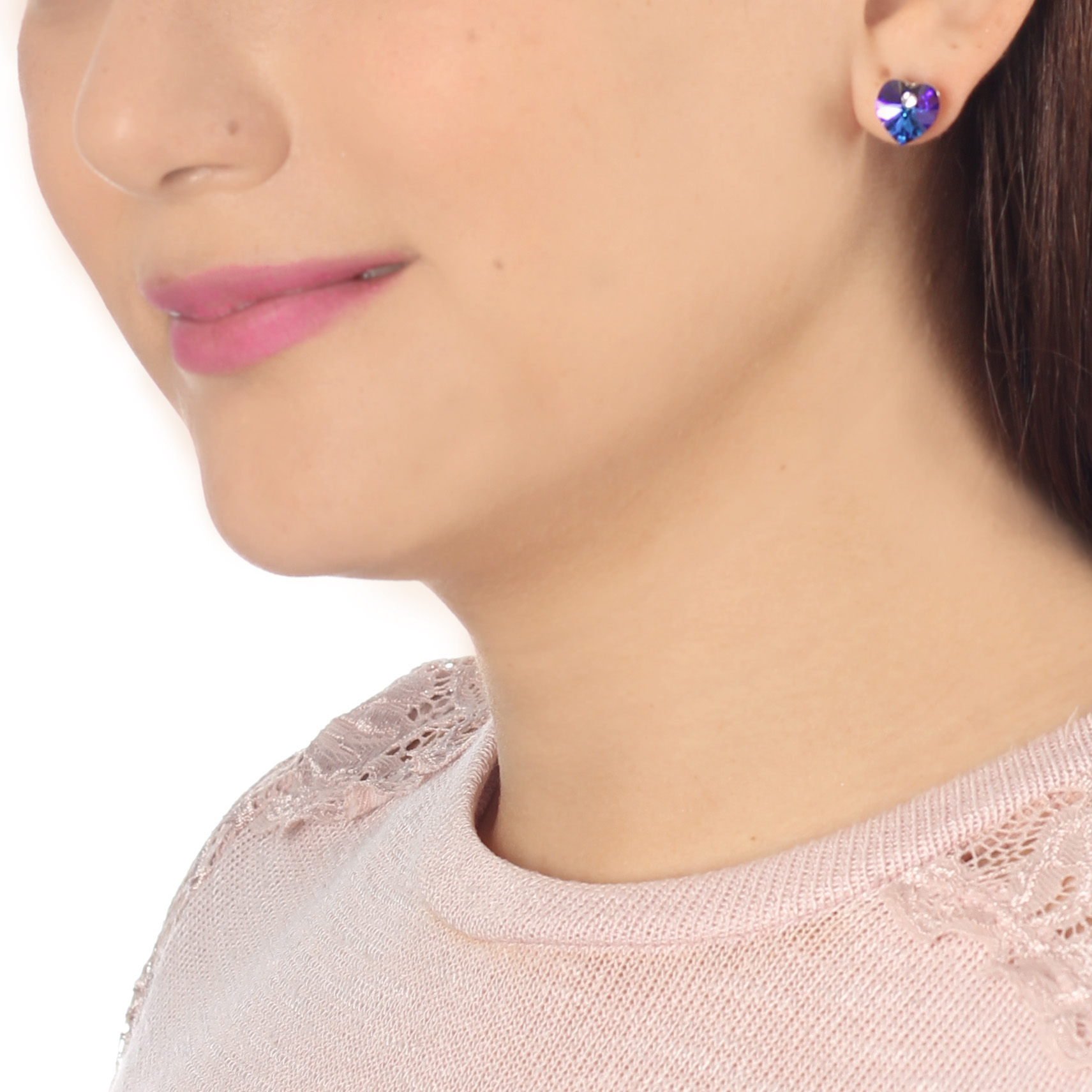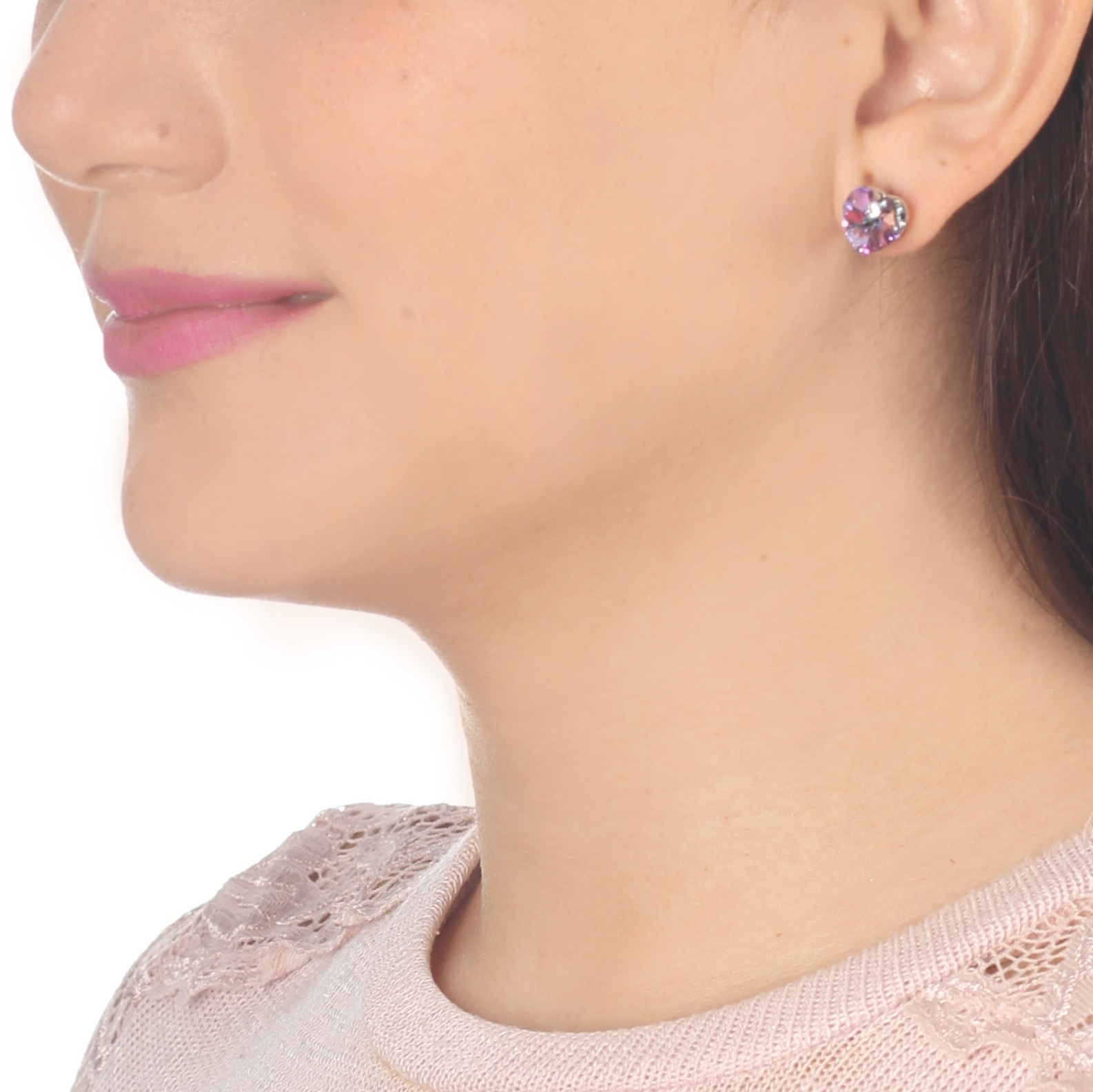 Hermoso juego de aretes en baño de oro blanco de 18 quilates, con tierno diseño de corazón e incrustraciones de cristales en colores azul, lila, morado, tornasol y rosa.
