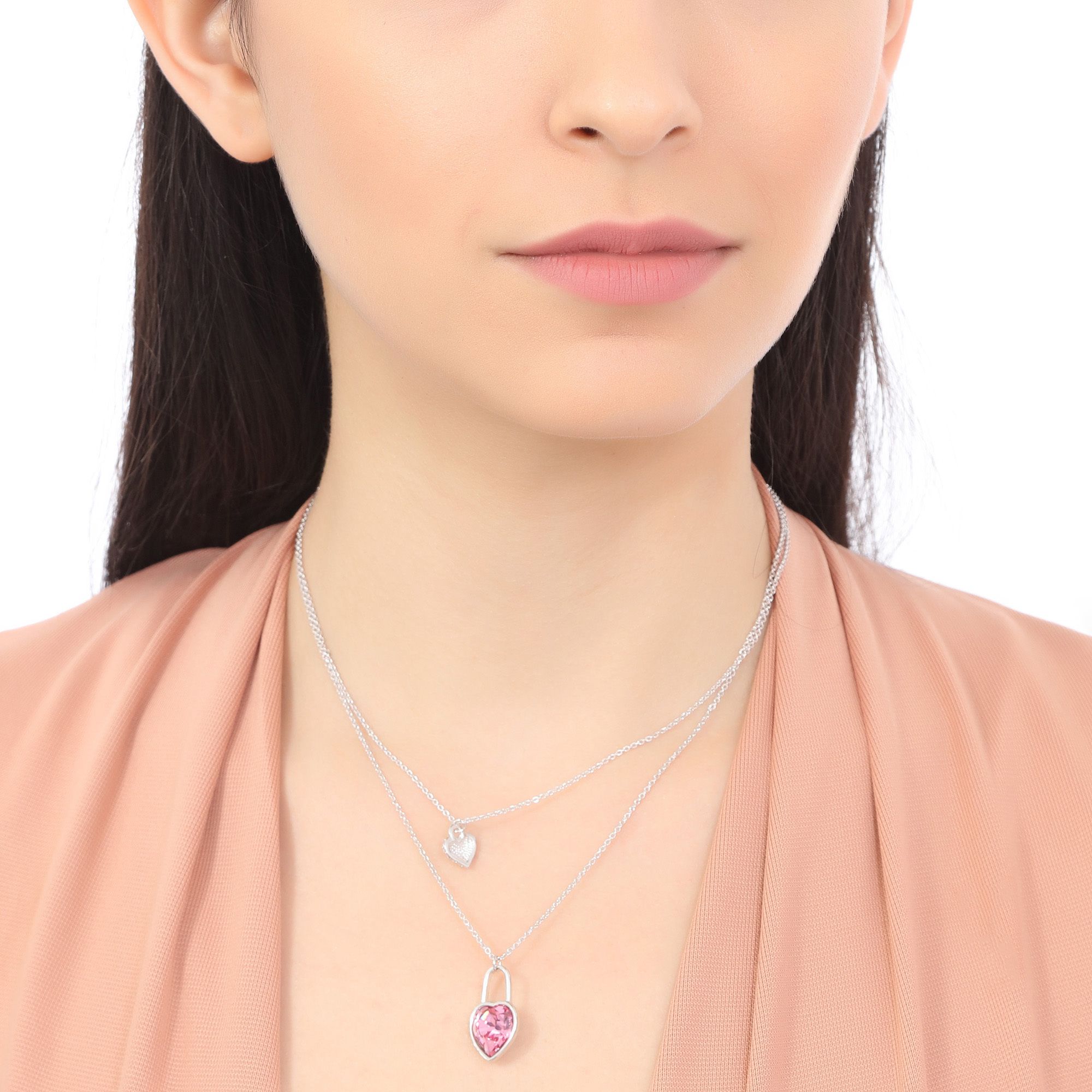 Collar en baño de oro blanco de 18 quilates, diseño de candado en forma de corazón, con cristal rosa, pequeño corazón plateado, incrustaciones de cristales blancos y cadena doble.