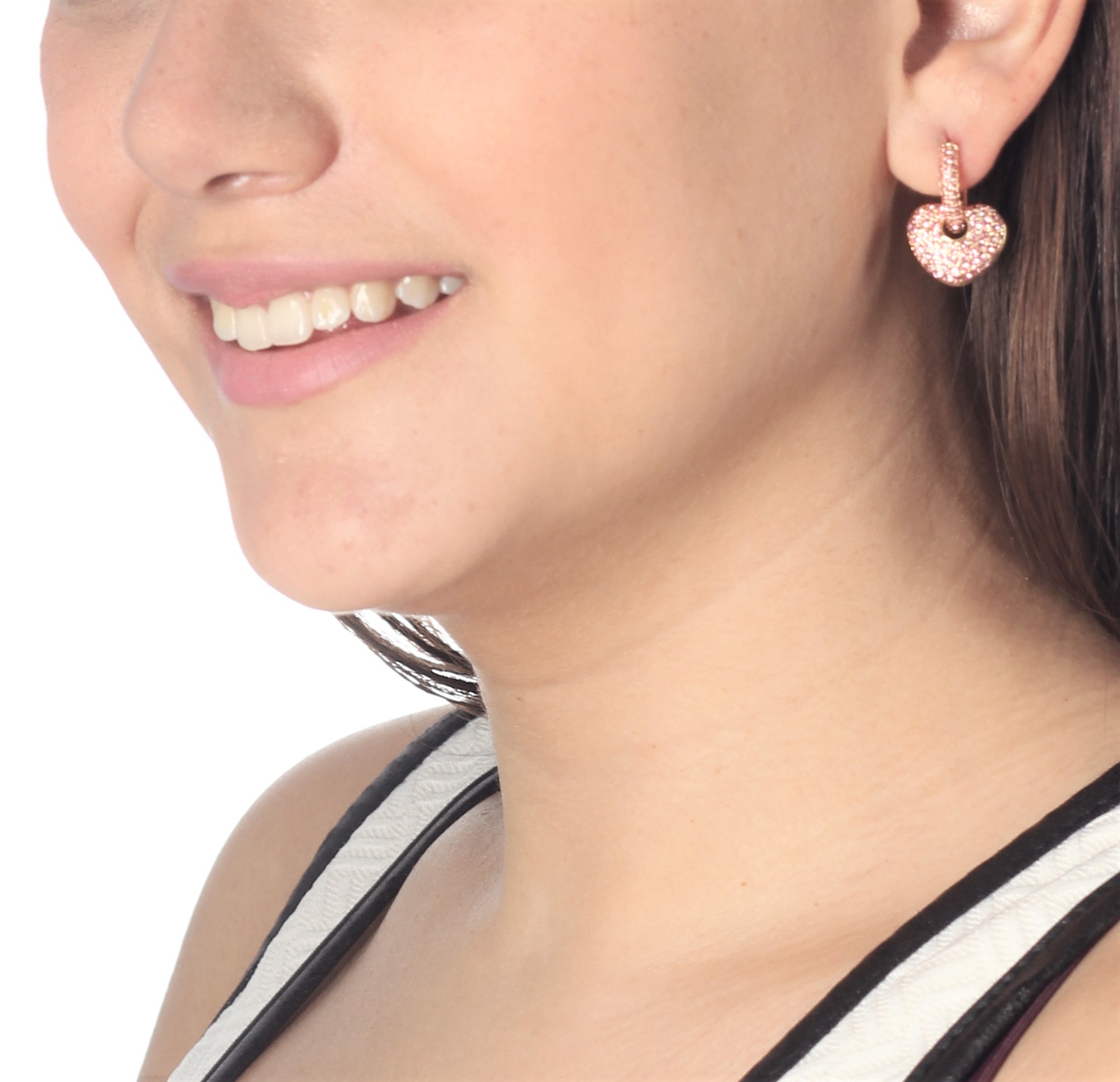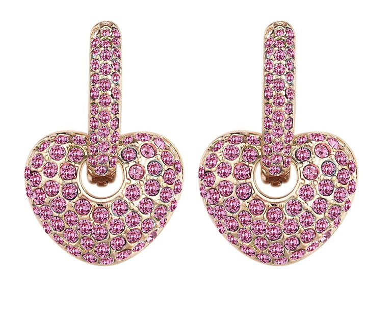 Hermosos aretes en baño de oro amarillo de 18 quilates, con diseño de corazón e incrustraciones de cristales en color rosa.