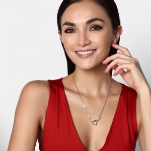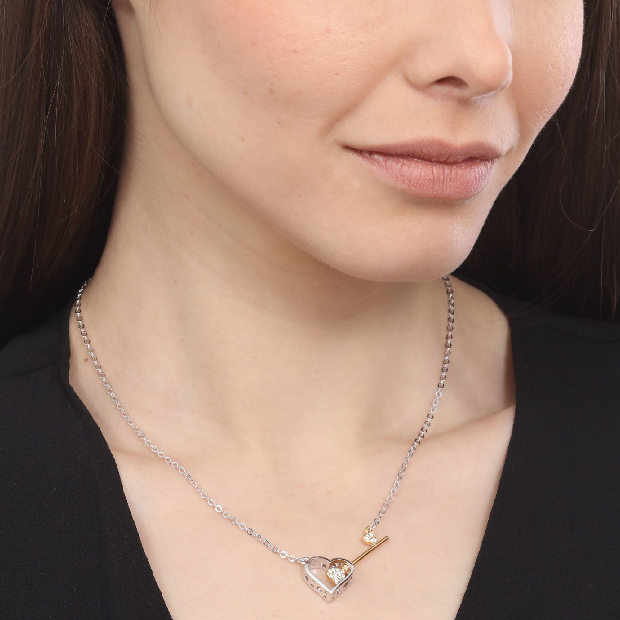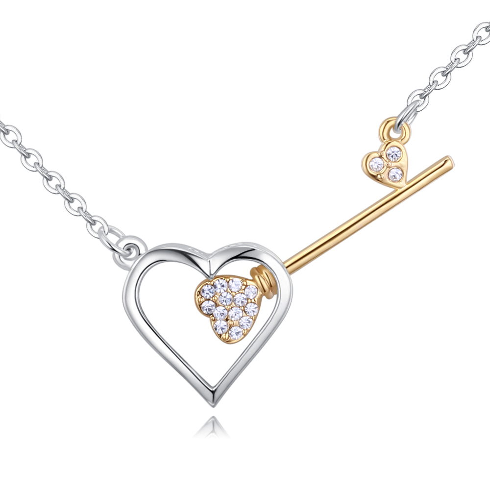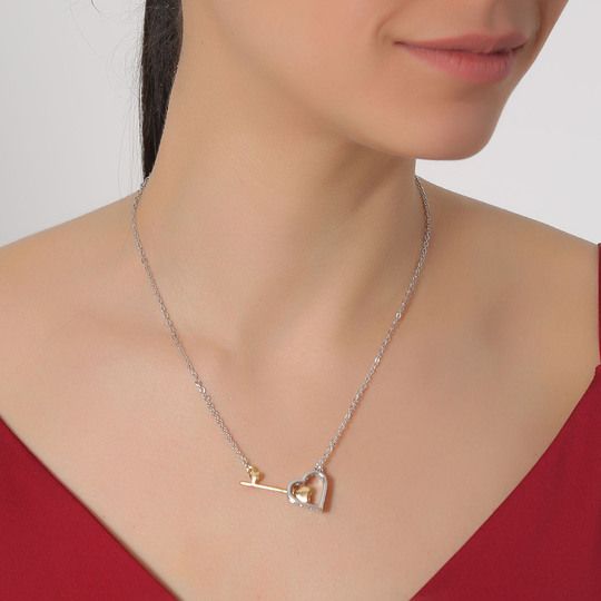 Collar en baño de oro blanco y amarillo de 18 quilates, diseño llave atravesando un corazón, con incrustaciones de cristales blancos.