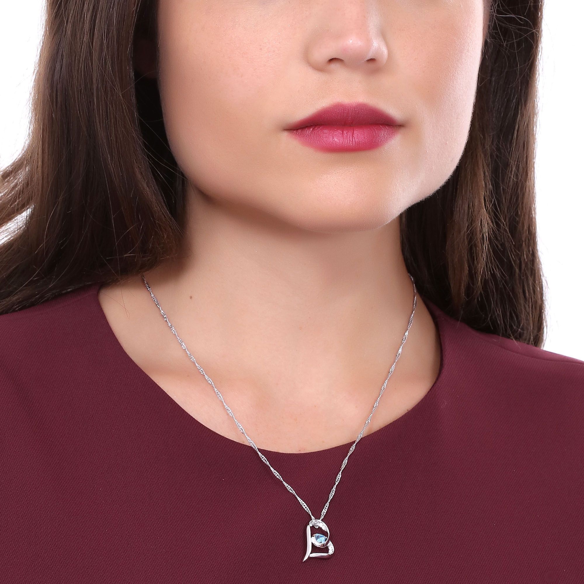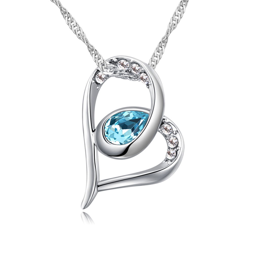Dije con cadena en baño de oro blanco de 18 quilates, diseño de corazón con incrustación de cristales en color blanco y azul.