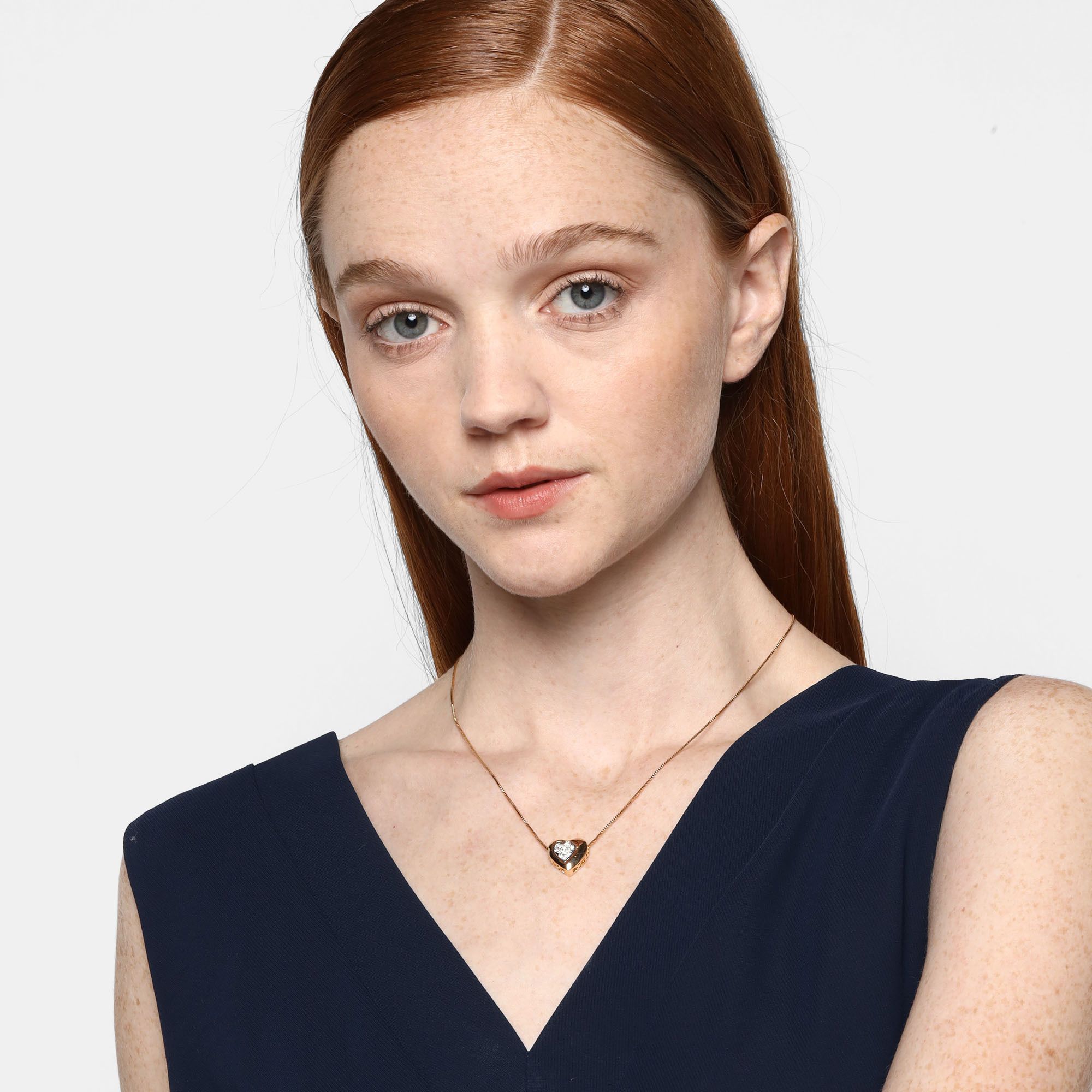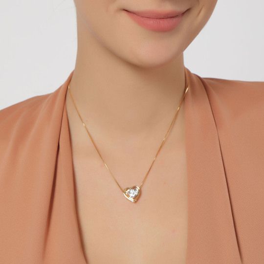 Dije con cadena en baño de oro amarillo y blanco de 18 quilates, diseño de corazón con incrustación de cristales en color blanco.