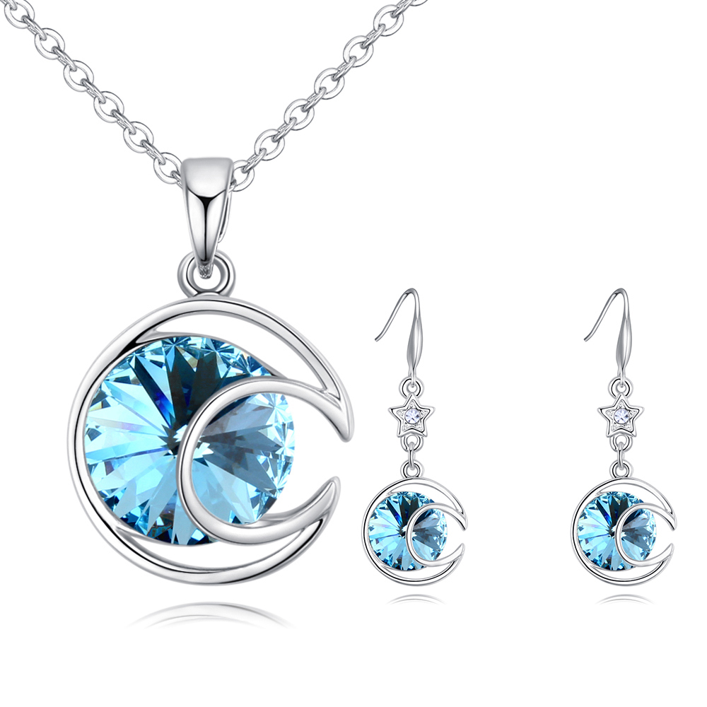 Juego de aretes y dije con cadena en baño de oro blanco de 18 quilates, diseño de media luna con incrustación de cristales en color azul.
