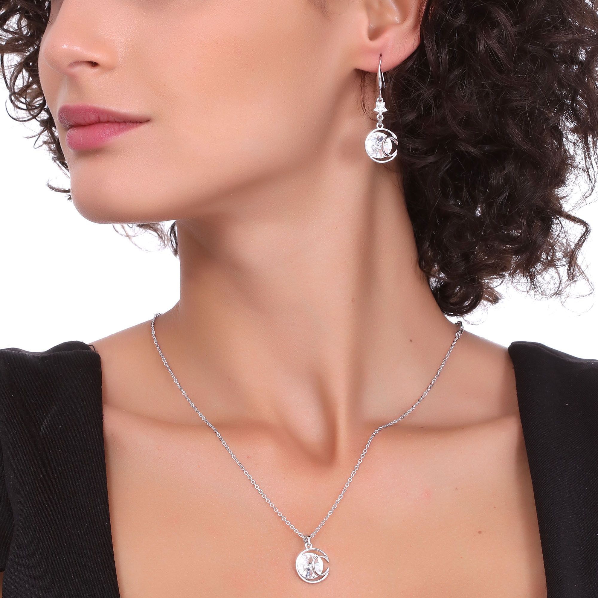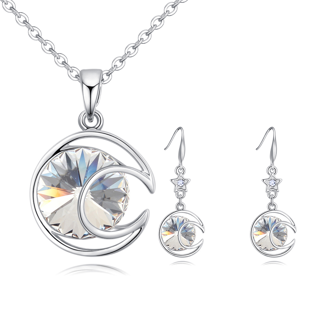 Juego de aretes y dije con cadena en baño de oro blanco de 18 quilates, diseño de media luna con incrustación de cristales en color blanco.