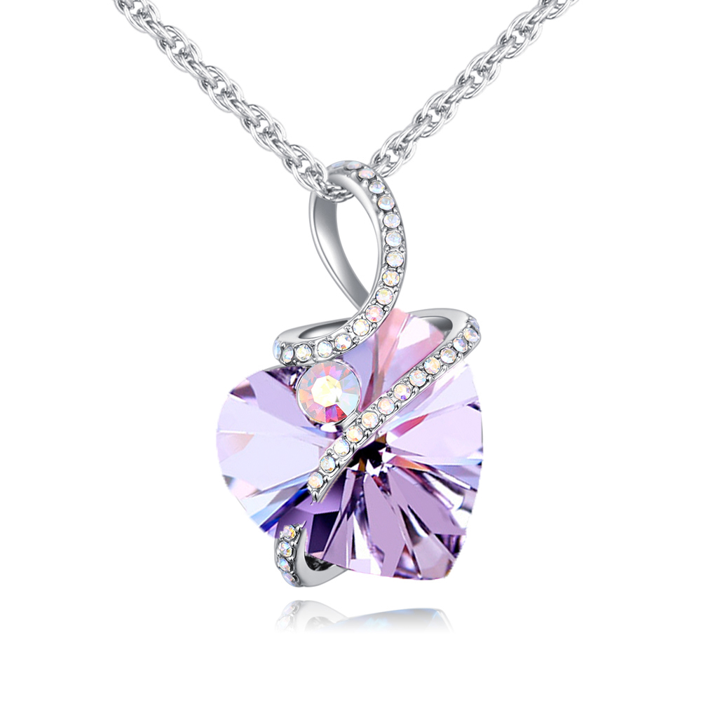 Dije con cadena en baño de oro blanco, diseño de corazón con incrustación de cristales en color tornasol y morado.