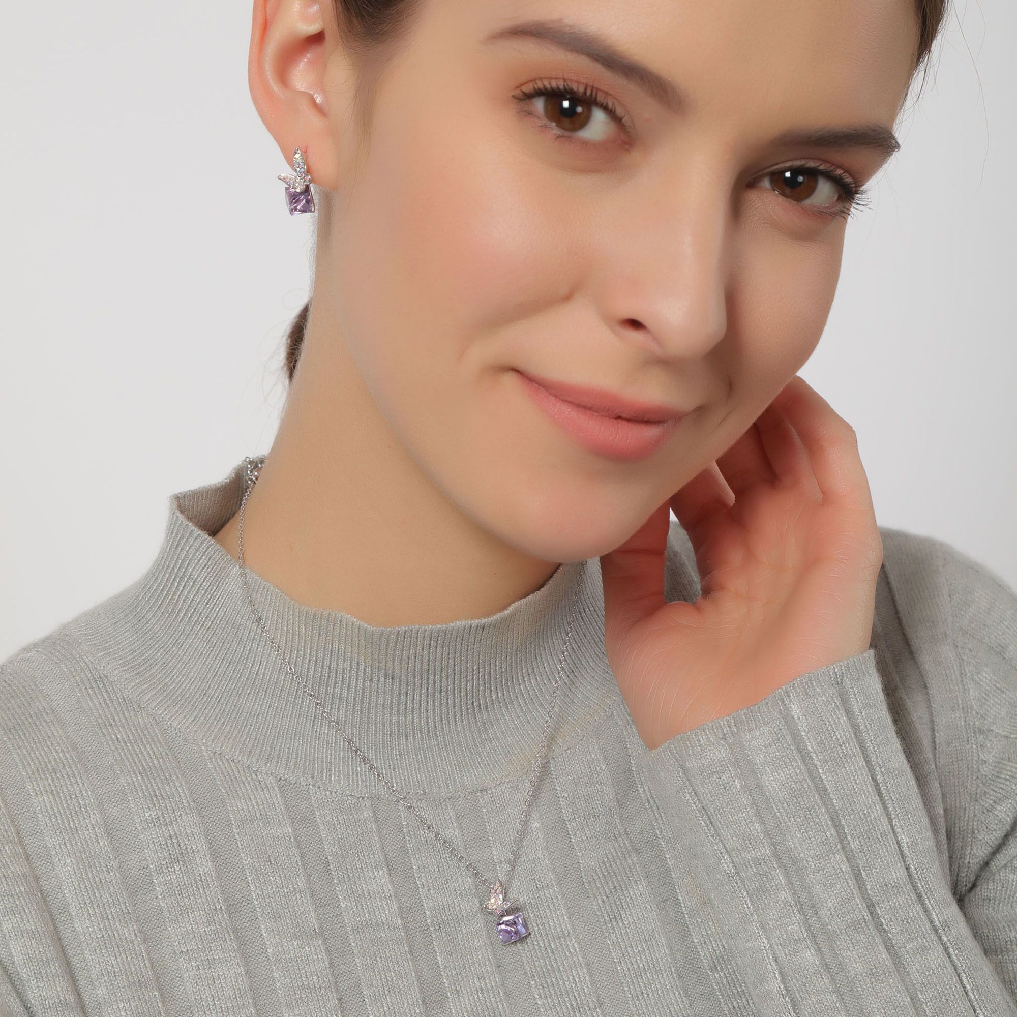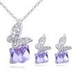 Juego de aretes y dije con cadena en baño de oro blanco de 18 quilates, diseño de mariposas sosteniendo un cristal incrustración de cristales en color morado y blanco.