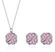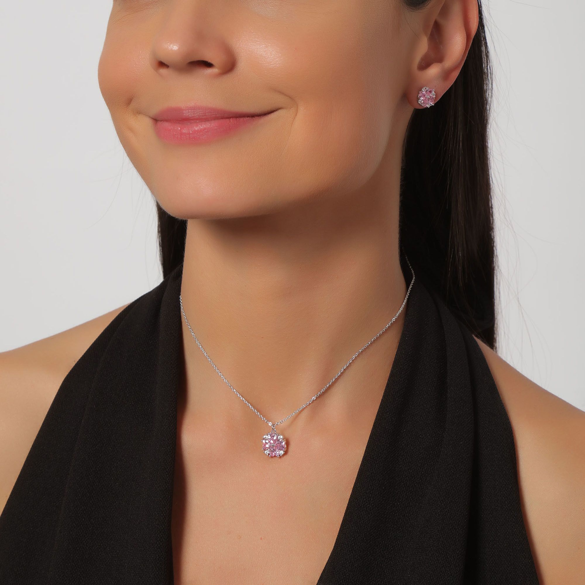 Juego de aretes y dije con cadena en baño oro blanco de 18 quilates, diseño de circulo y corazones al centro, incrustración de cristales rosas y blancos.