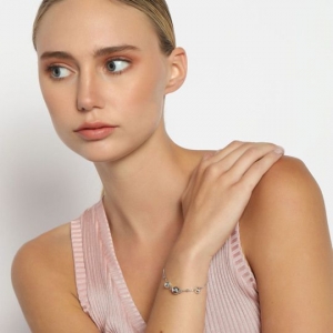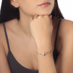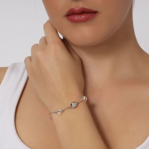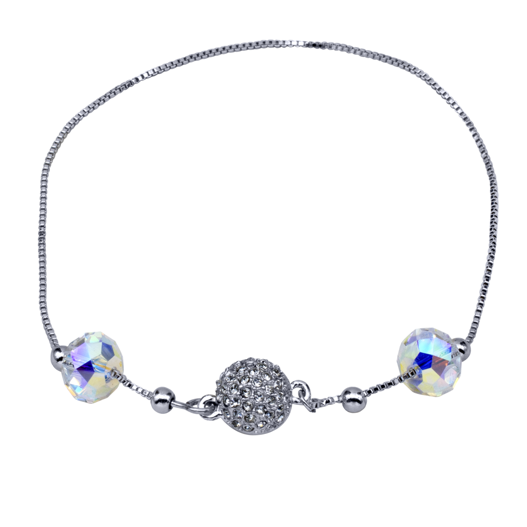 Hermosa pulsera, en baño de oro blanco de 18 quilates, broche de esfera con imán, incrustaciones de cristales blancos y cuentas de cristal tornasol.