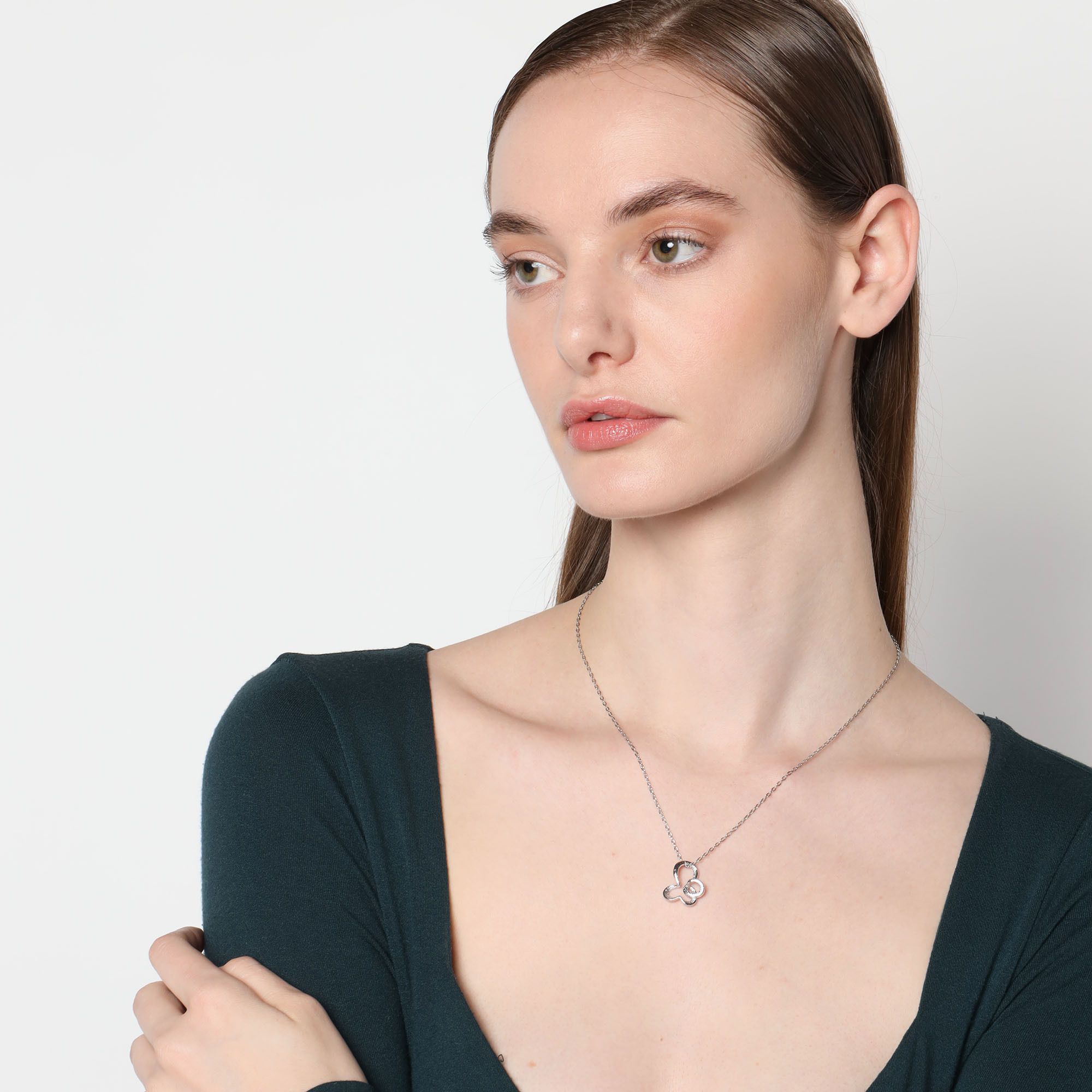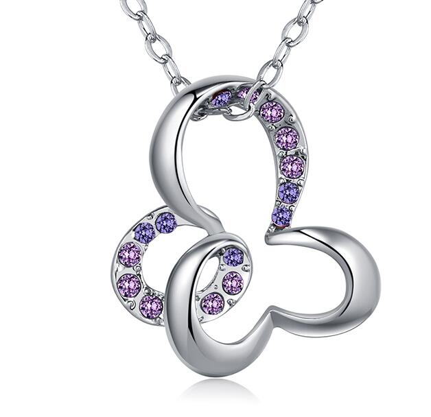 Dije con cadena en baño de oro blanco de 18 quilates, diseño de mariposa con incrustación de cristales en color morado.