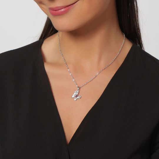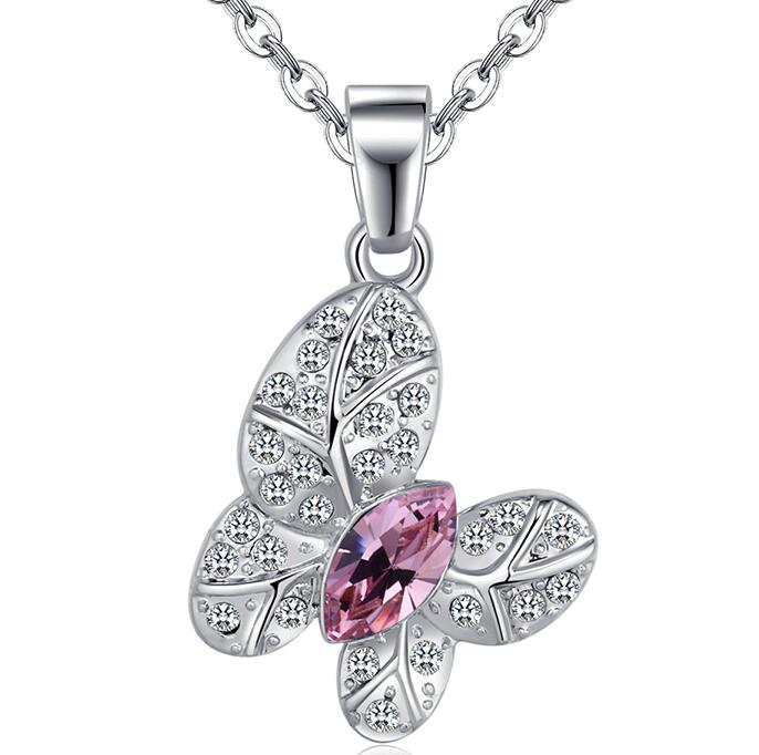 Precioso dije con cadena en baño de oro blanco de 18 quilates, diseño de pequeña mariposa con incrustaciones de cristales en color blanco y lila. Fabricado en una estructura de aleación de platino con rodio sin níquel. 1. Joyería hipoalergénica. 2. Incluye cajita de joyería. 3. Garantía de 30 días por defectos de fabrica.