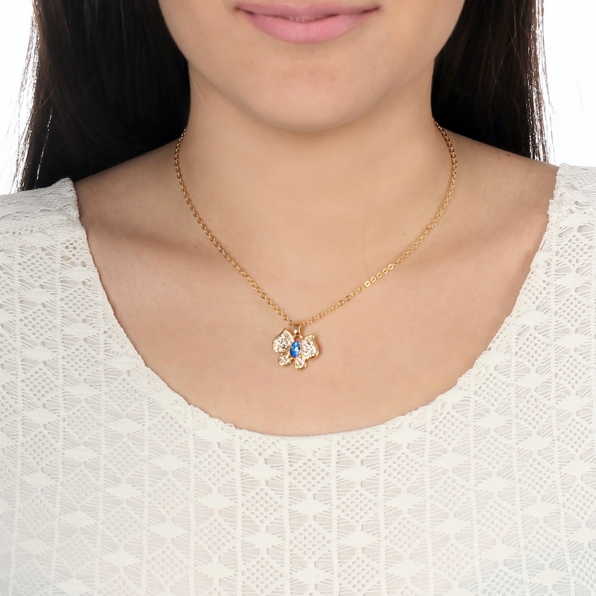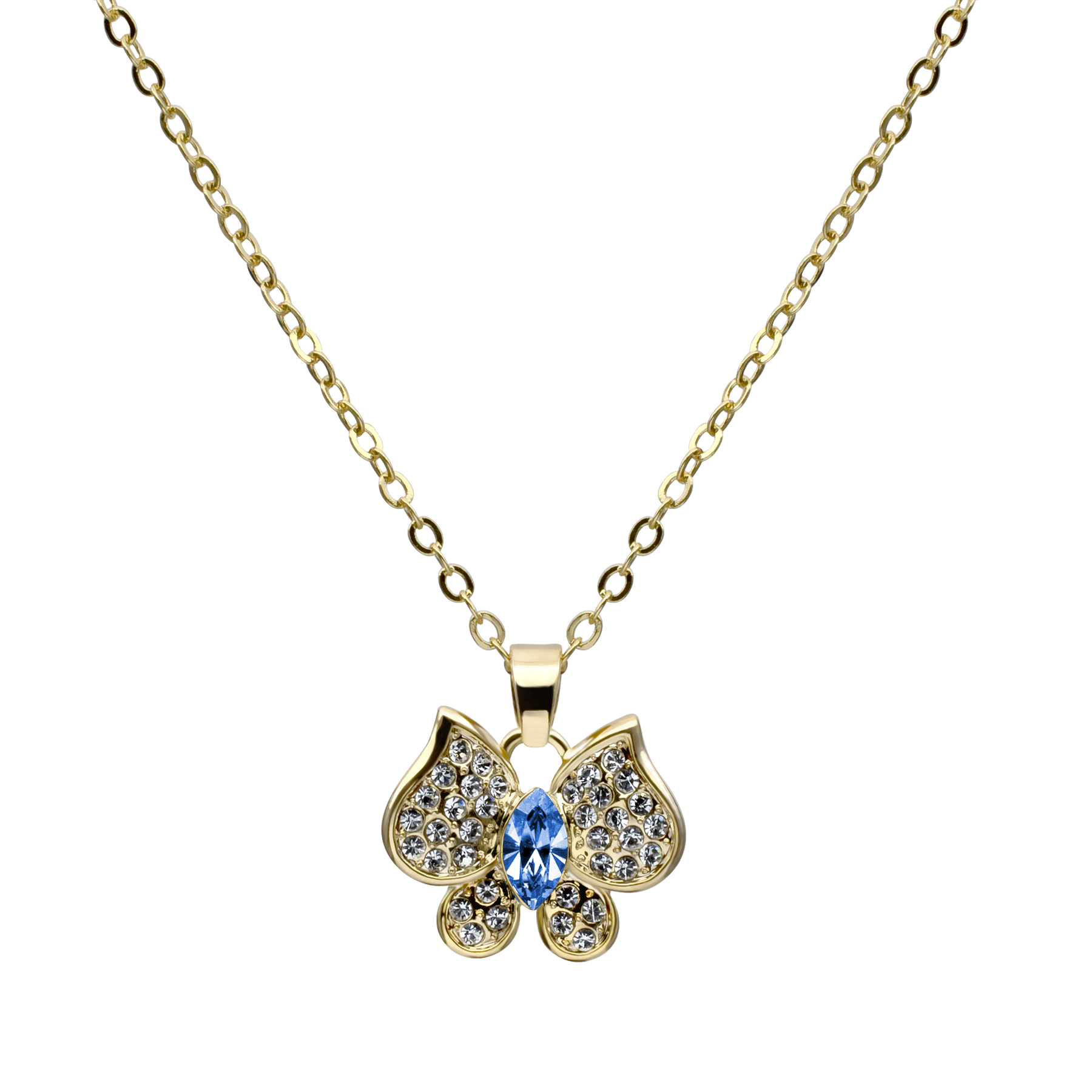 Precioso dije con cadena en baño de oro amarillo de 18 quilates, lindo diseño de mariposa con incrustaciones de cristales en color blanco y azul. Fabricado en una estructura de aleación de platino con rodio sin níquel. 1. Joyería hipoalergénica. 2. Incluye cajita de joyería. 3. Garantía de 30 días por defectos de fabrica.