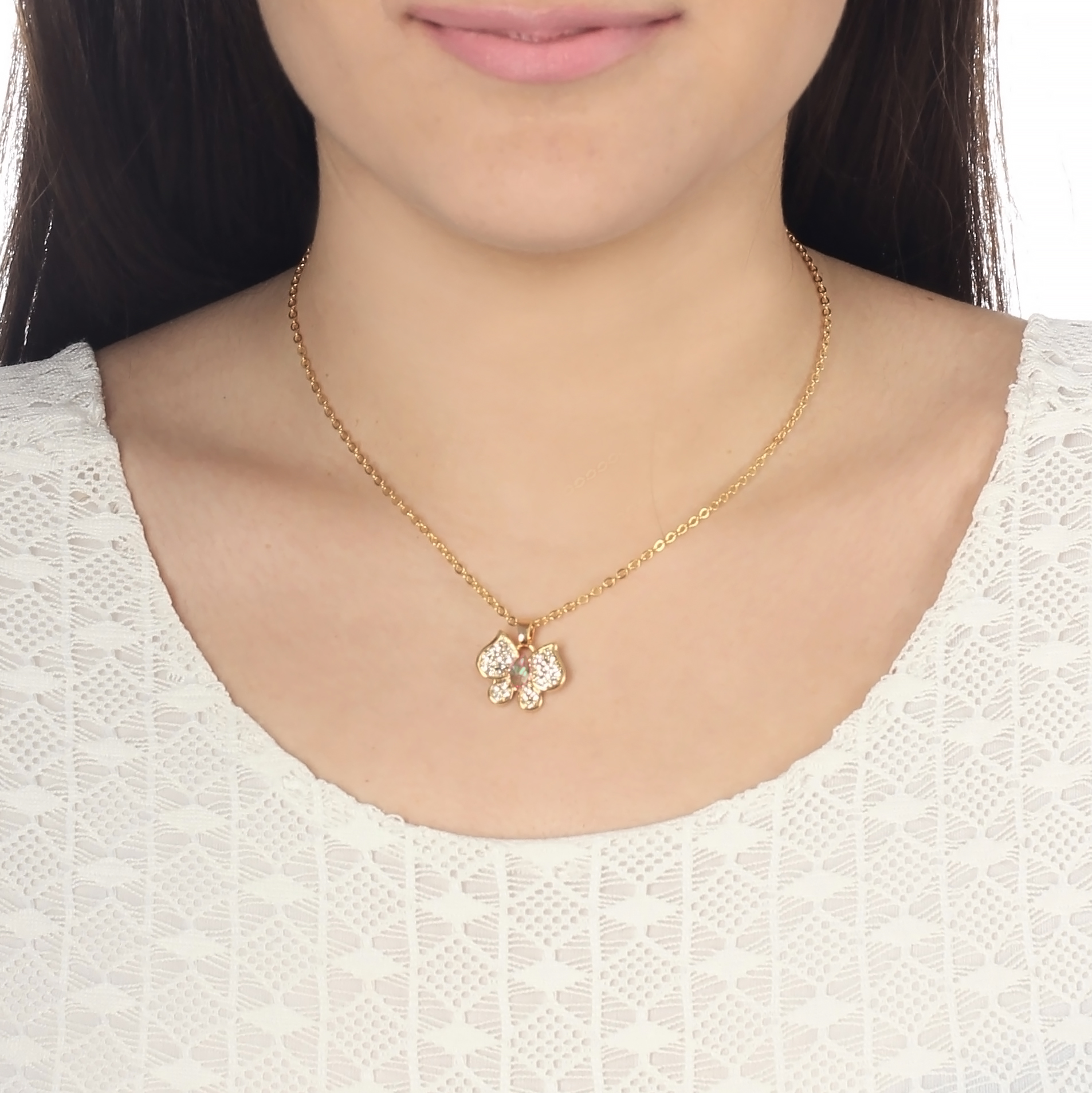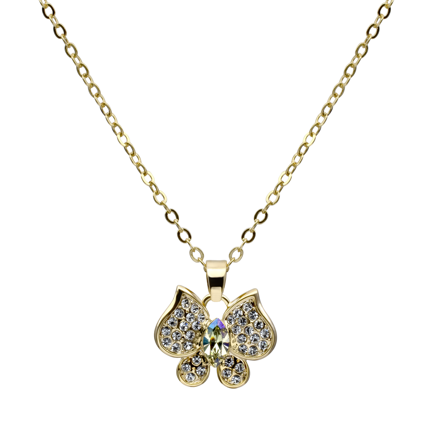 Precioso dije con cadena en baño de oro amarillo de 18 quilates, lindo diseño de mariposa con incrustaciones de cristales en color blanco y tornasol. Fabricado en una estructura de aleación de platino con rodio sin níquel. 1. Joyería hipoalergénica. 2. Incluye cajita de joyería. 3. Garantía de 30 días por defectos de fabrica.