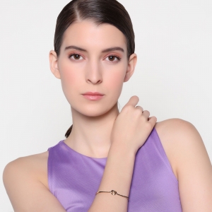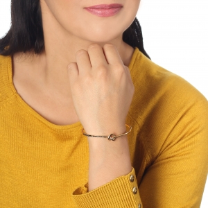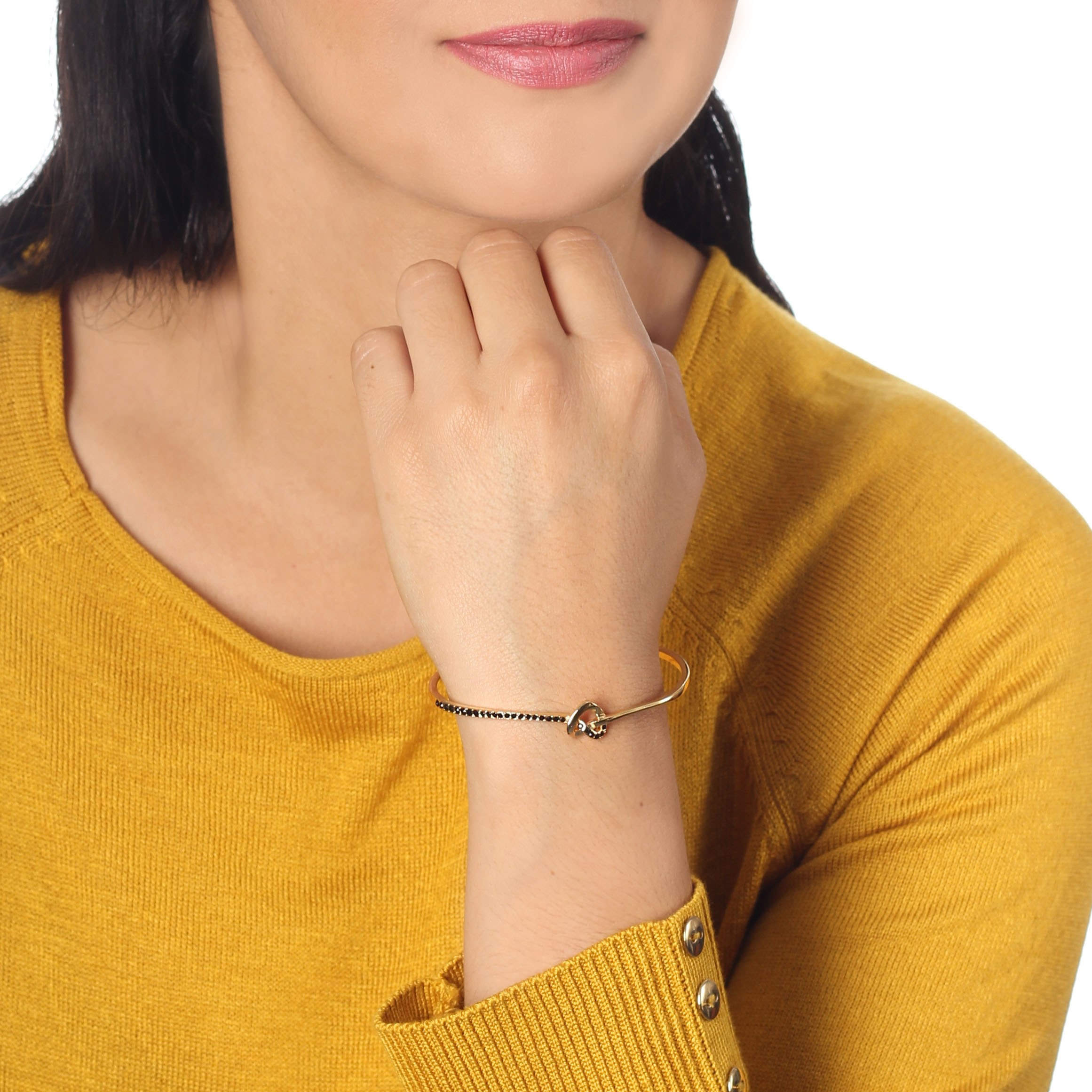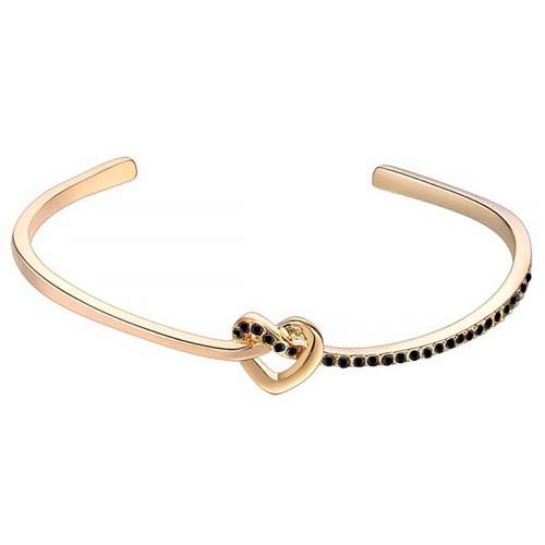 Bella pulsera, en baño de oro amarillo de 18 quilates, diseño de nudo en forma de corazón, con incrustaciones de cristales en color negro.