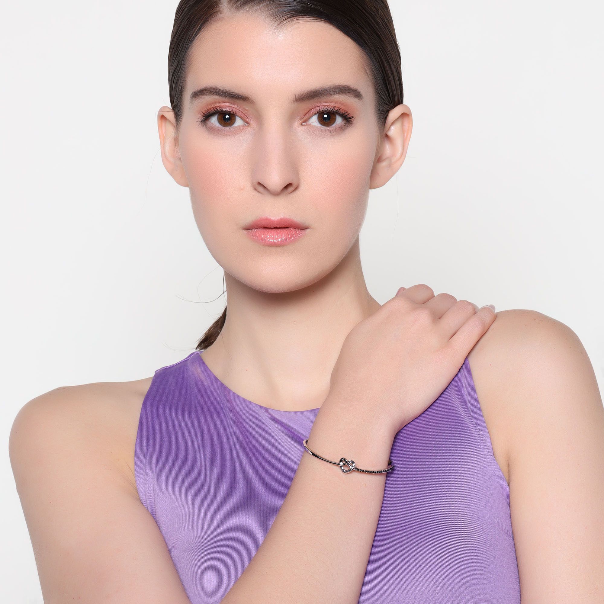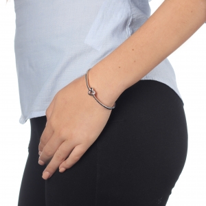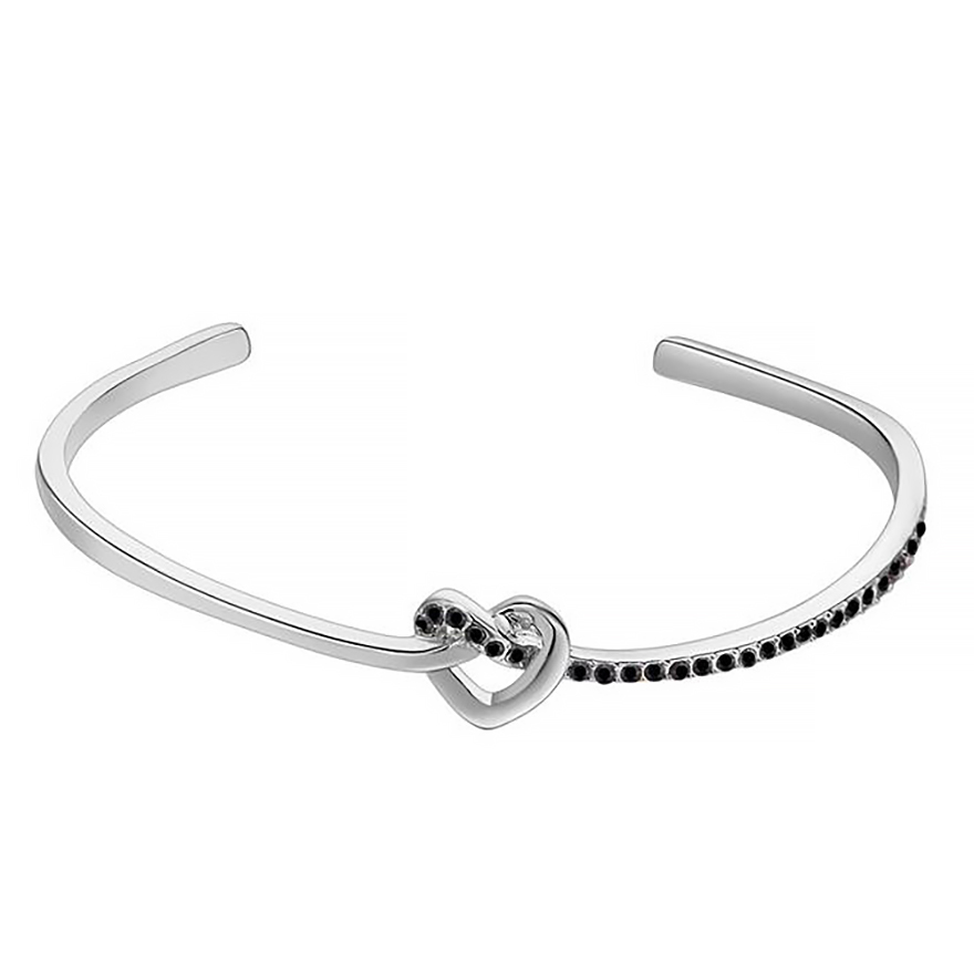 Bella pulsera, en baño de oro blanco de 18 quilates, diseño de nudo en forma de corazón, con incrustaciones de cristales en color negro.