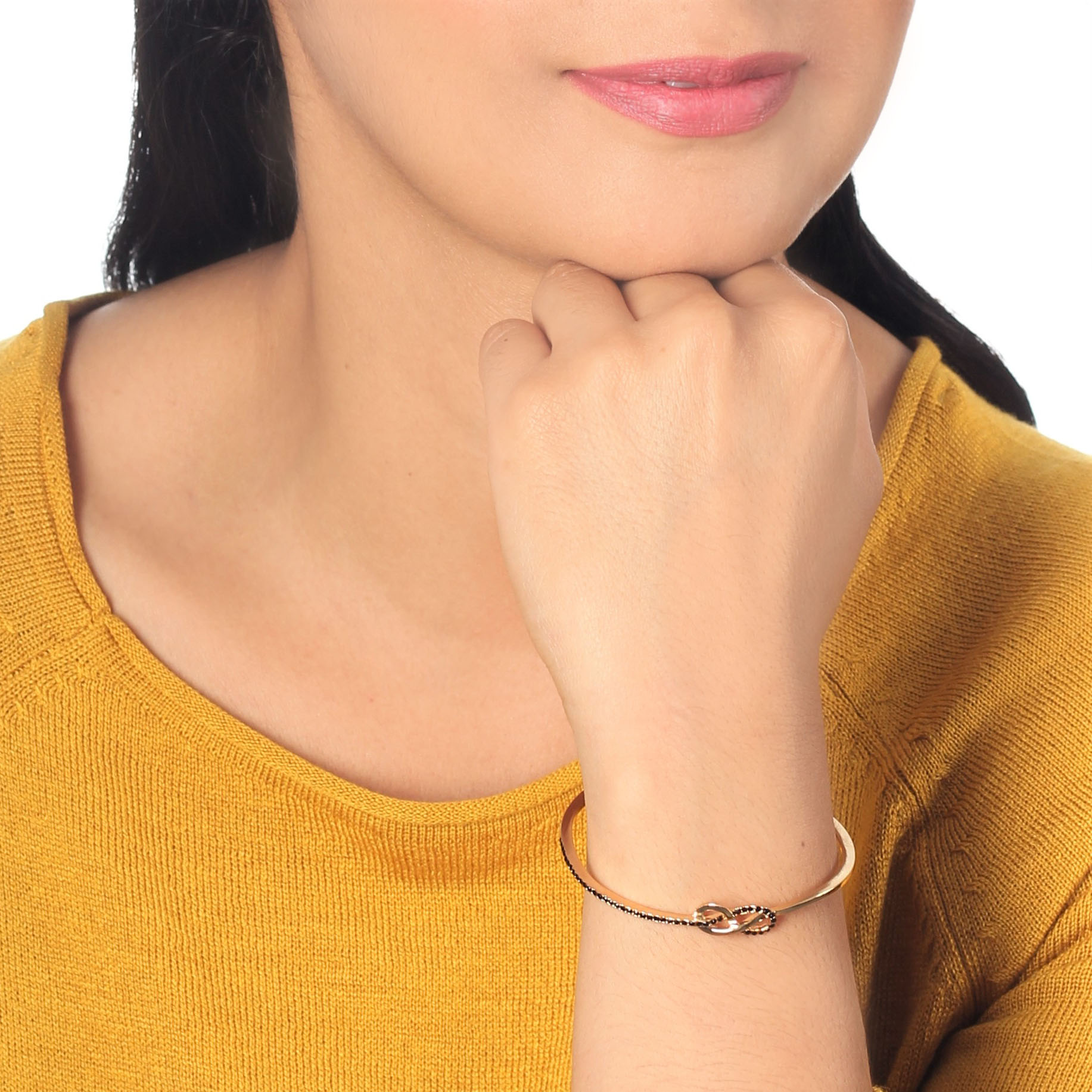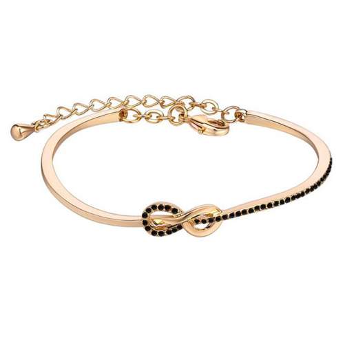 Original pulsera, en baño de oro amarillo de 18 quilates, diseño de nudo en forma de infinito, con incrustaciones de cristales en color negro.