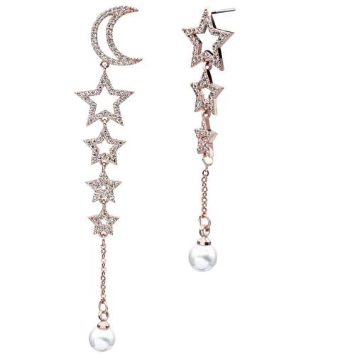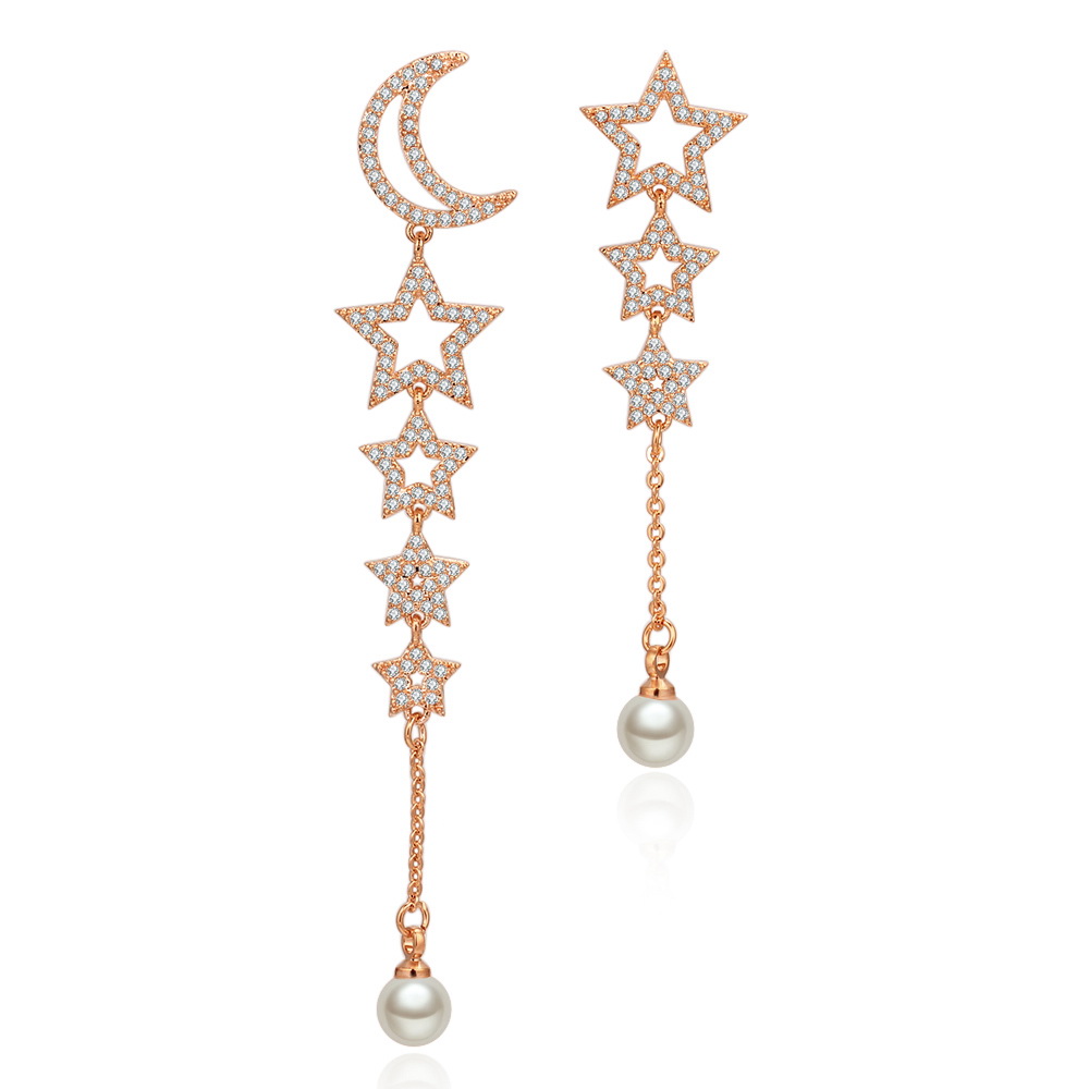 Aretes en baño de oro rosa de 18 quilates, diseño de péndulo con luna y estrellas, perla blanca e incrustaciones de cristales blancos.