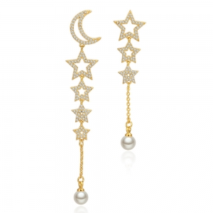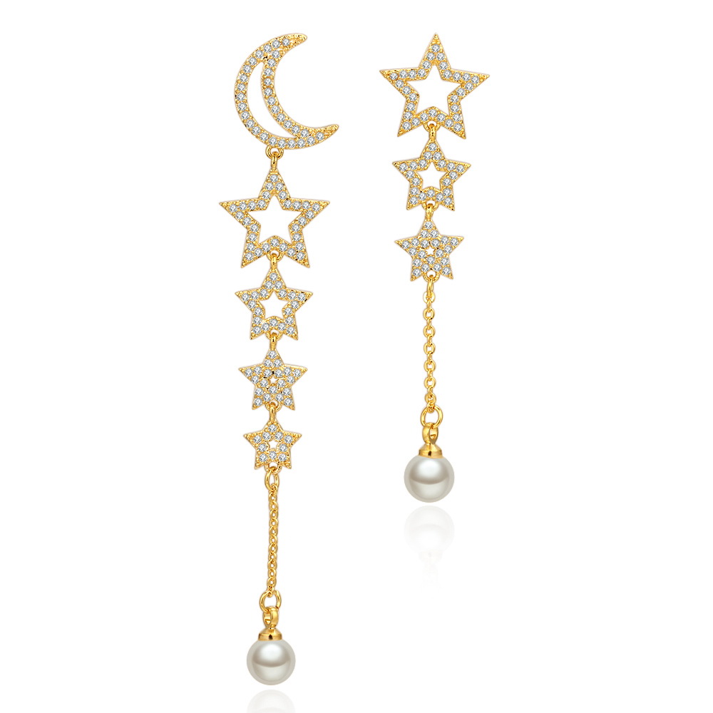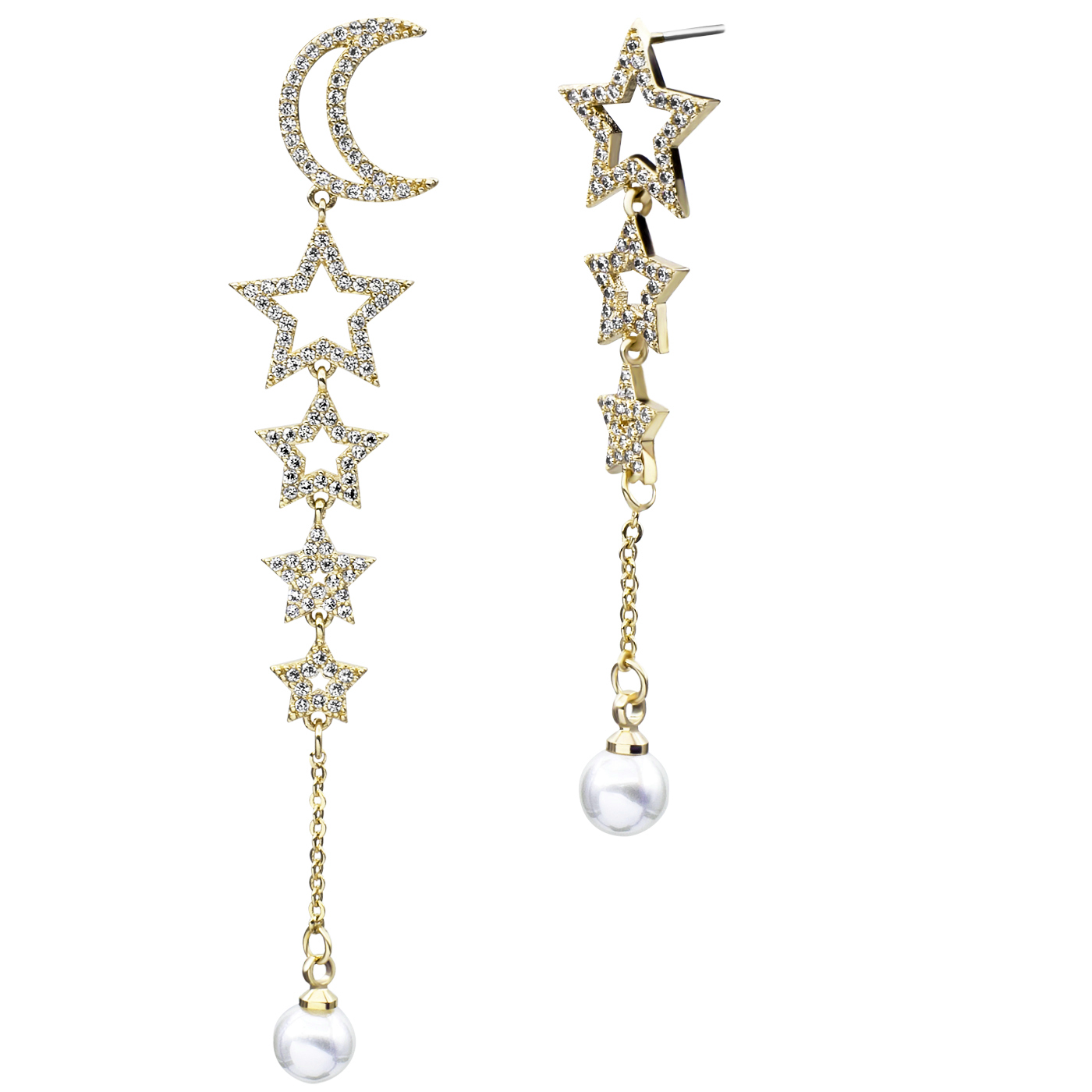 Aretes en baño de oro amarillo de 18 quilates, diseño de péndulo con luna y estrellas, con perla blanca e incrustaciones de cristales blancos.