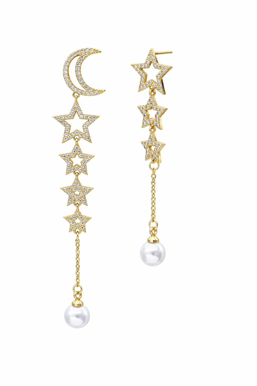 Aretes en baño de oro amarillo de 18 quilates, diseño de péndulo con luna y estrellas, con perla blanca e incrustaciones de cristales blancos.