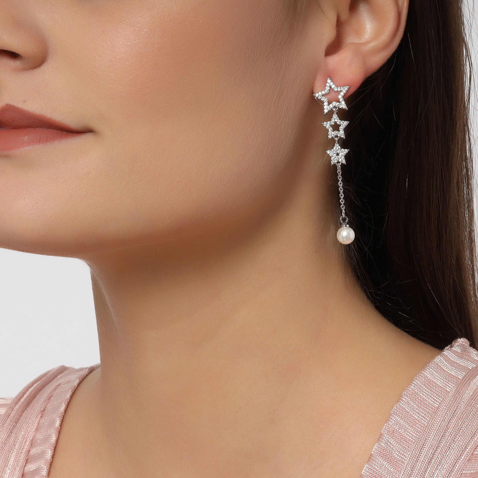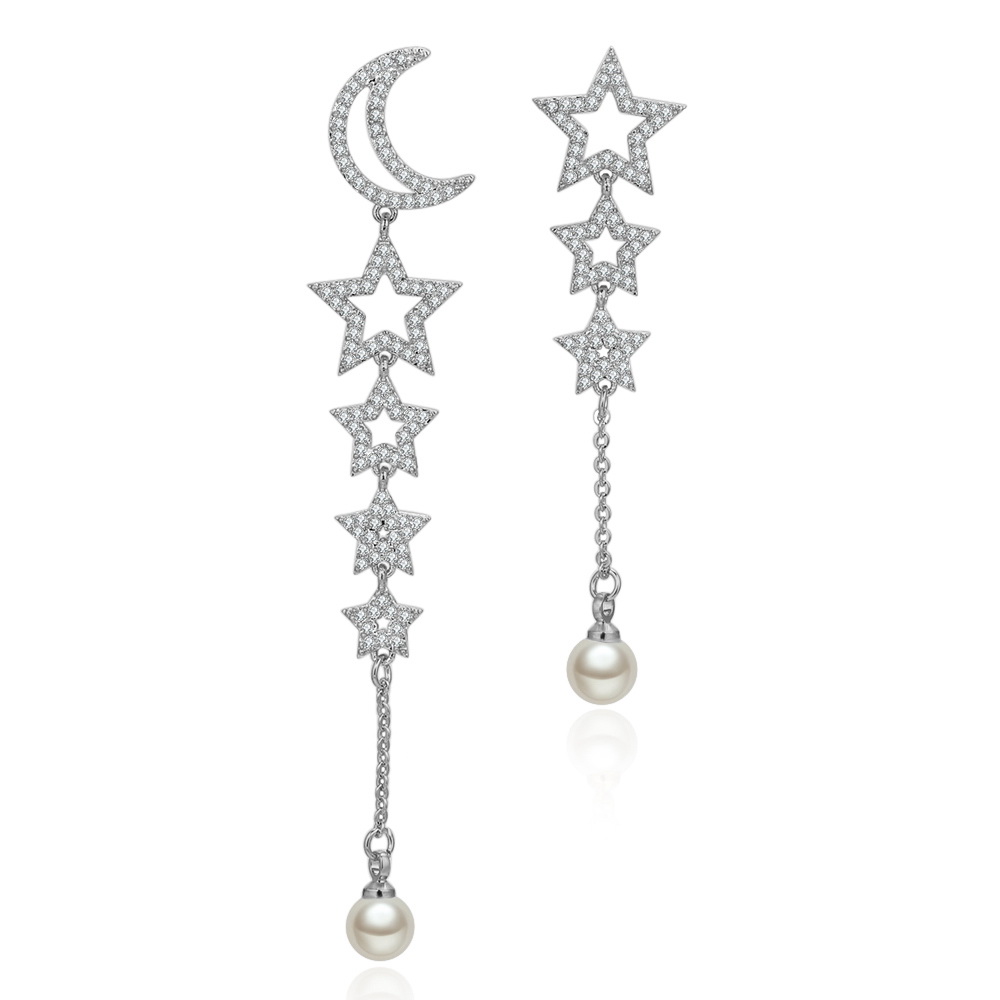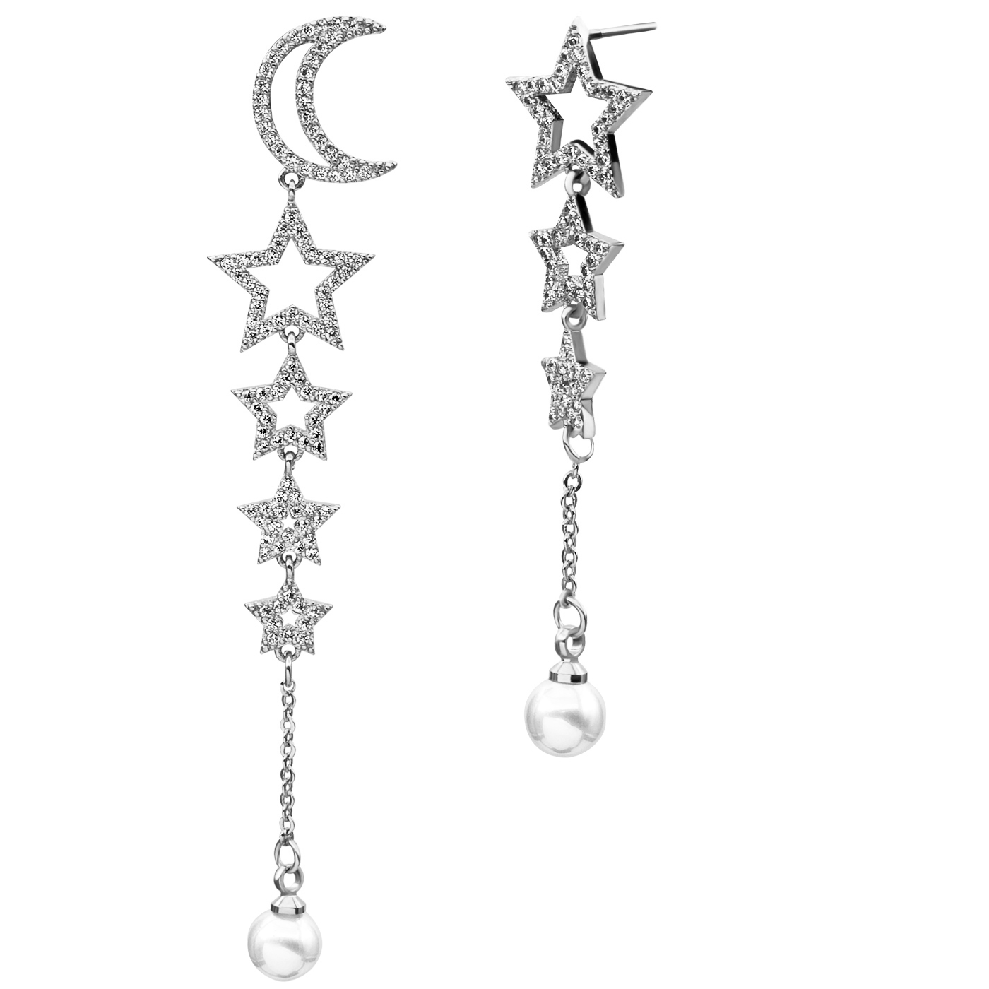 Aretes en baño de oro blanco de 18 quilates, diseño de péndulo con luna y estrellas, con perla blanca e incrustaciones de cristales blancos.