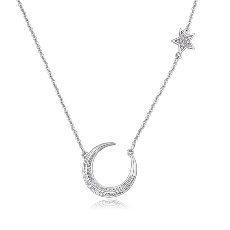 Collar en baño de oro blanco de 18 quilates, diseño de luna y estrella con incrustaciones de cristales en color blanco.