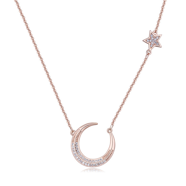 Dije con cadena en baño de oro rosa de 18 quilates, diseño de luna y estrella, incrustación de cristales en color blanco.