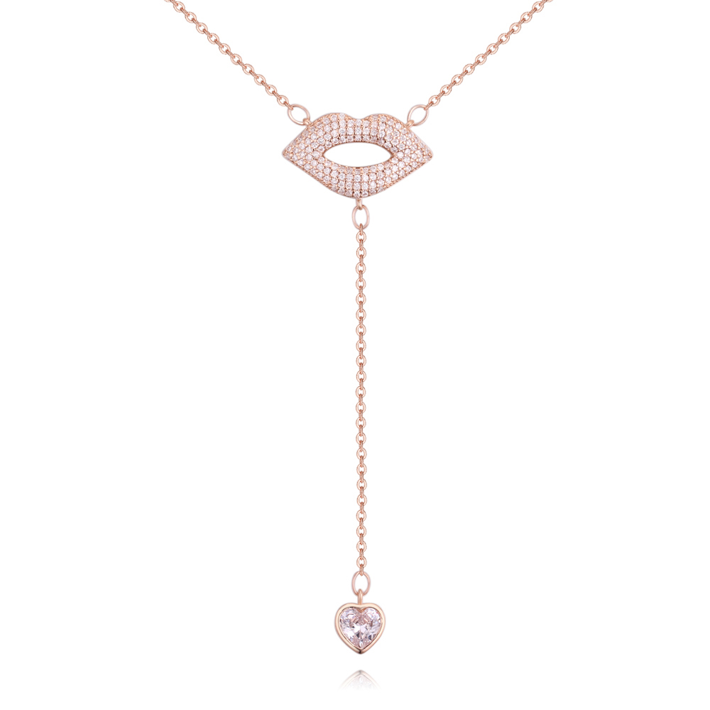 Divertido collar en baño de oro rosa de 18 quilates, diseño de labios y péndulo con un corazón de cristal e incrustaciones de cristales en color blanco.