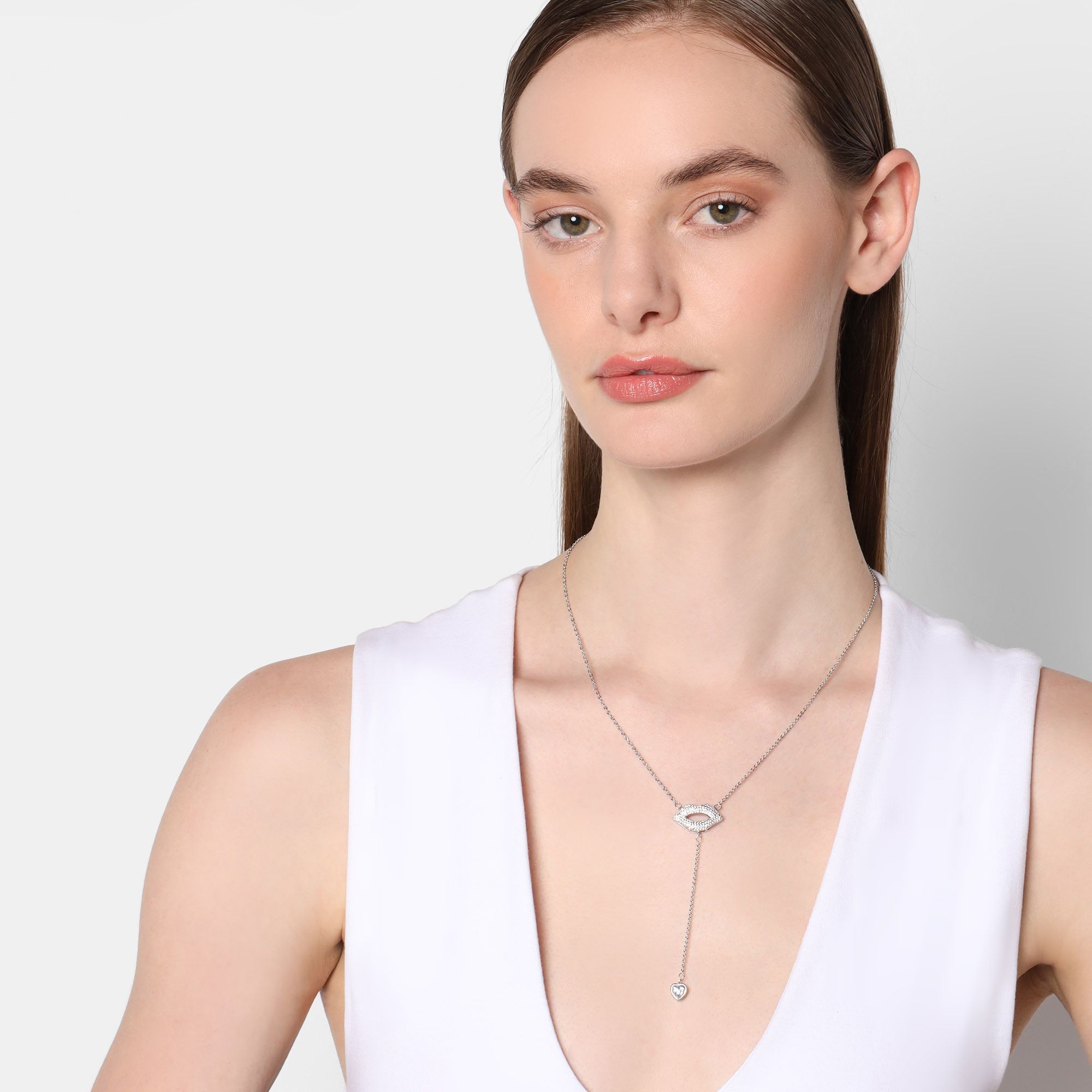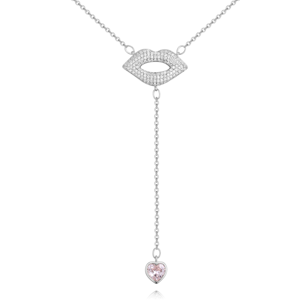 Divertido collar en ba�o de oro blanco de 18 quilates, dise�o de labios y p�ndulo con un coraz�n de cristal, e incrustaciones de cristales en color blanco.