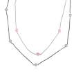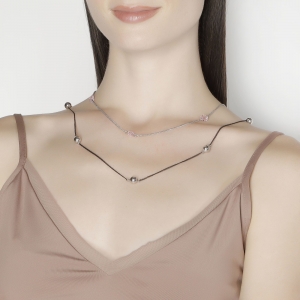 Collar para sweater en baño de oro blanco de 18 quilates, con doble cadena, diseño de esferas y tréboles de cristal color rosa.
