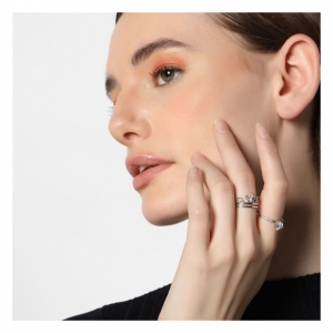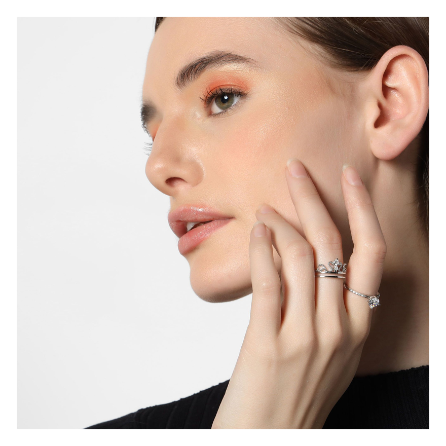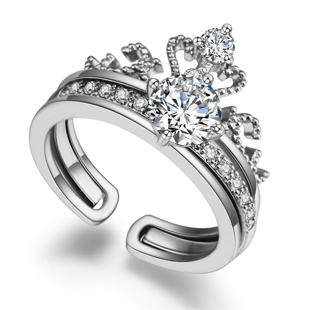 Hermoso anillo doble, en baño de oro blanco de 18 quilates, diseño de corona, e incrustación de cristales en color blanco.